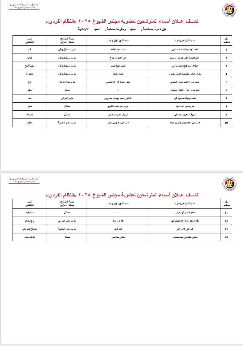 أعلنت الهيئة الوطنية للانتخابات برئاسة القاضي حازم بدوي عن الكشوف المبدئية لأسماء المترشحين لعضوية مجلس الشيوخ 2025 ورموزهم، وذلك وفقًا للجدول الزمني المقرر قانونًا.