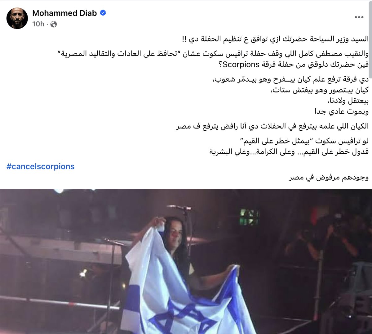 دعا عدد كبير من مستخدمي مواقع التواصل الاجتماعي، وزير السياحة شريف فتحي، ومصطفى كامل نقيب المهن الموسيقية، للتدخل وإلغاء حفل الفريق الغنائي الألماني scorpions، والمقرر إقامته في مصر خلال شهر أكتوبر المقبل.