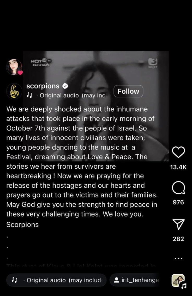 ودشن مستخدمو مواقع التواصل الاجتماعي، هشتاج تحت اسم #cancelscorpions، فسروا من خلاله أسباب مطالبتهم بإلغاء حفل فريق scorpions الألماني، عبر سردهم لمواقف ونشرهم صورا للفريق، يوضح دعمهم الكامل لجيش الاحتلال الإسرائيلي، ورفع العلم الإسرائيلي في حفلاتهم.