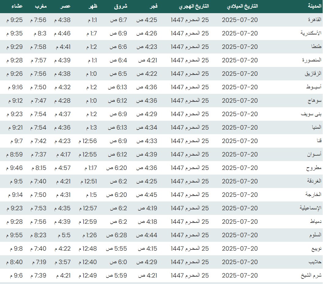 وفيما يلي مواقيت الصلاة، لعدد من مدن ومحافظات الجمهورية من واقع بيانات الهيئة العامة للمساحة