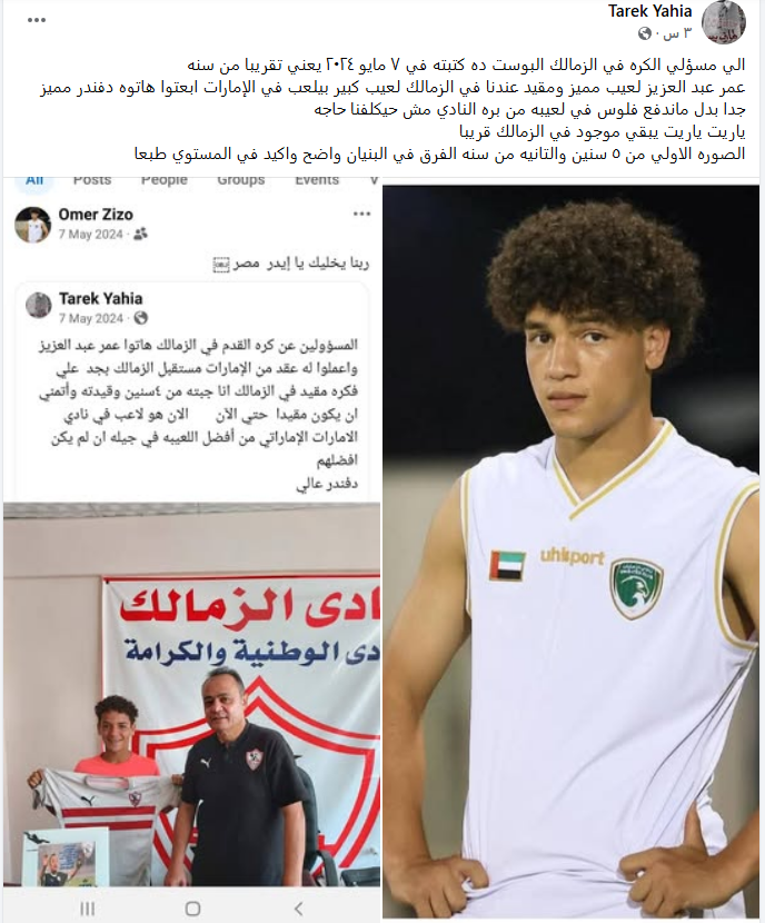 إلى مسؤولي الكرة في الزمالك البوست ده كتبته في 7 مايو 2024 يعني تقريبا من سنة، عمر عبد العزيز لعيب مميز، وكان مقيد عندنا في الزمالك لعيب كبير بيلعب في الإمارات ابعتوا هاتوه دفندر مميز جدا بدل ما ندفع فلوس في لعيبه من بره النادي مش حيكلفنا الكثير.