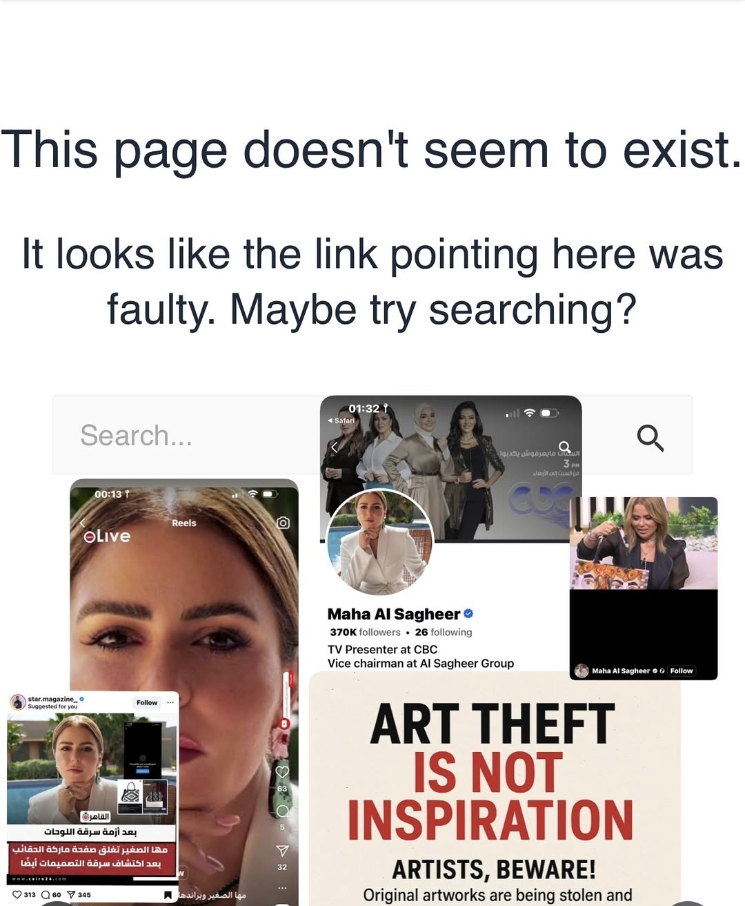 وقد كشفت في بيان عبر حساباتها على وسائل التواصل الاجتماعي، عن تفاجئها باستخدام إحدى أعمالها الفنية الأصلية بشكل تجاري من قبل مها الصغير، وذلك بعد تنبيه من قبل بعض متابعيها.