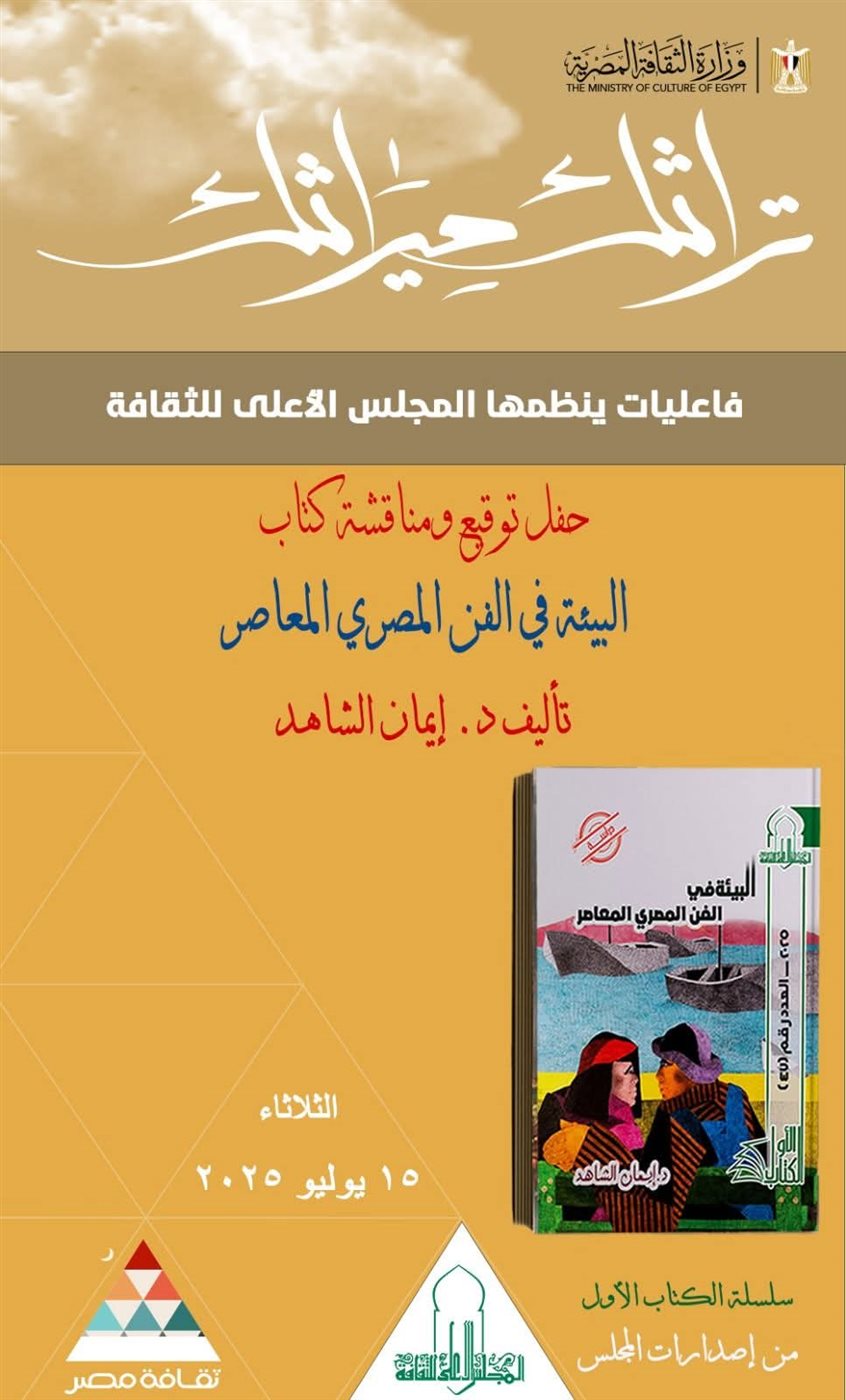 يطلق المجلس الأعلى للثقافة "حفل توقيع ومناقشة كتاب البيئة في الفن المصري المعاصر" تأليف: د إيمان الشاهد ومن إصدارات سلسلة الكتاب الأول بالمجلس، ضمن مبادرة "تراثك ميراثك"، التي تنظمها وزارة الثقافة على مدار شهر يوليو 2025.