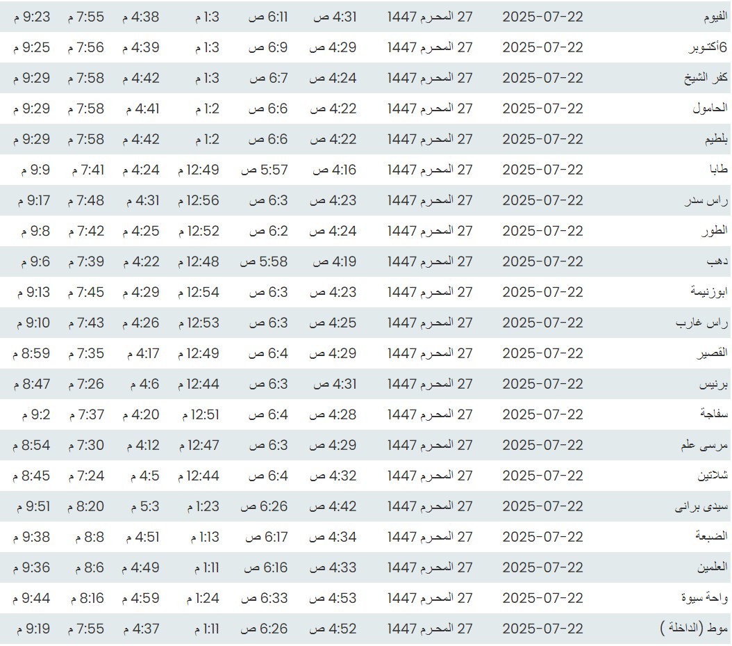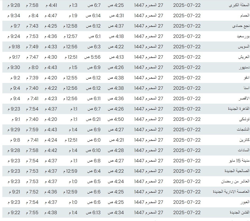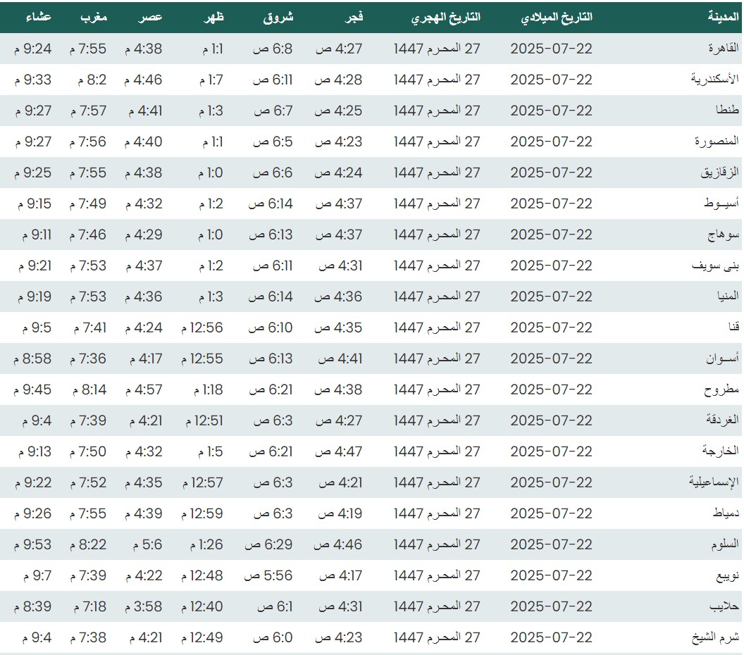 وفيما يلي مواقيت الصلاة، لعدد من مدن ومحافظات الجمهورية من واقع بيانات الهيئة العامة للمساحة