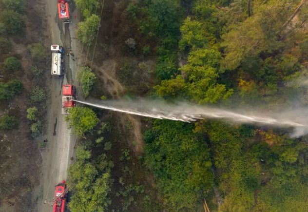 وأظهر مقطع فيديو من طائرة بدون طيار الحرائق وهي تتقدم على طول جبهة واسعة في منطقة وعرة، وتشتعل من حين لآخر عندما تقترب من الغابات الجافة.