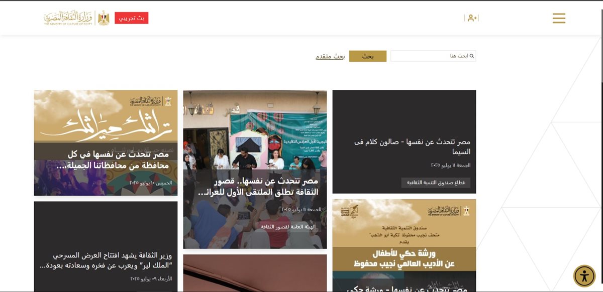 ويُعد الموقع الالكتروني لوزارة الثقافة، منصة شاملة تُعرّف بقطاعات وهيئات الوزارة المختلفة ومواقعها، وتعرض أبرز الفعاليات والأجندة الثقافية والفنية، والتطبيقات الرقمية، إلى جانب تقديم خدمات إلكترونية وروابط تفاعلية للجمهور، فضلًا عن مواد أرشيفية وبيانات رسمية مُحدَّثة.