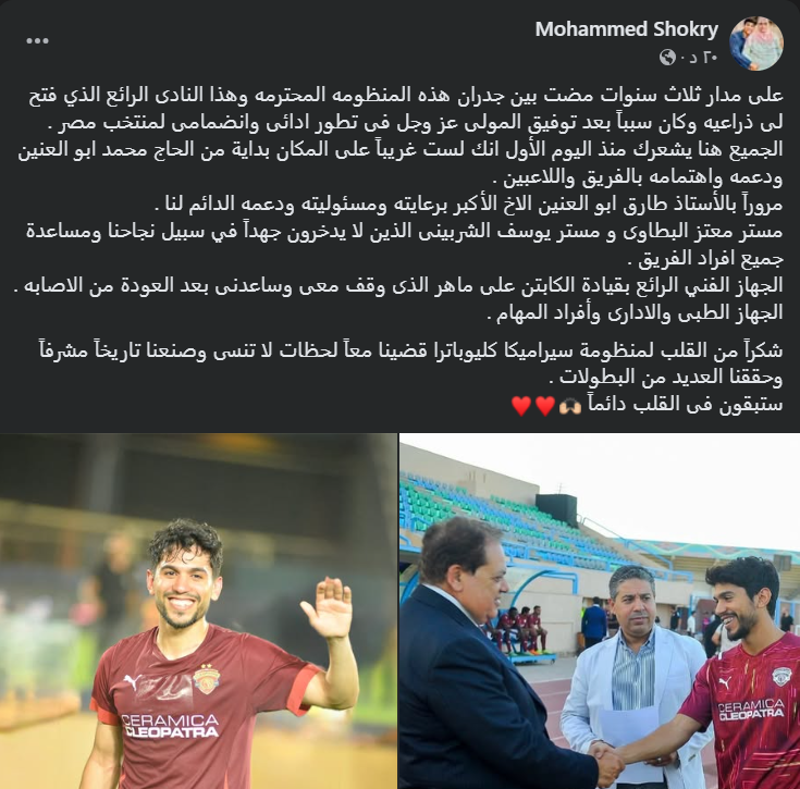 واختتم: “شكرًا من القلب لمنظومة سيراميكا كليوباترا قضينا معًا لحظات لا تنسى وصنعنا تاريخًا مشرفًا وحققنا العديد من البطولات، ستبقون فى القلب دائمًا”.