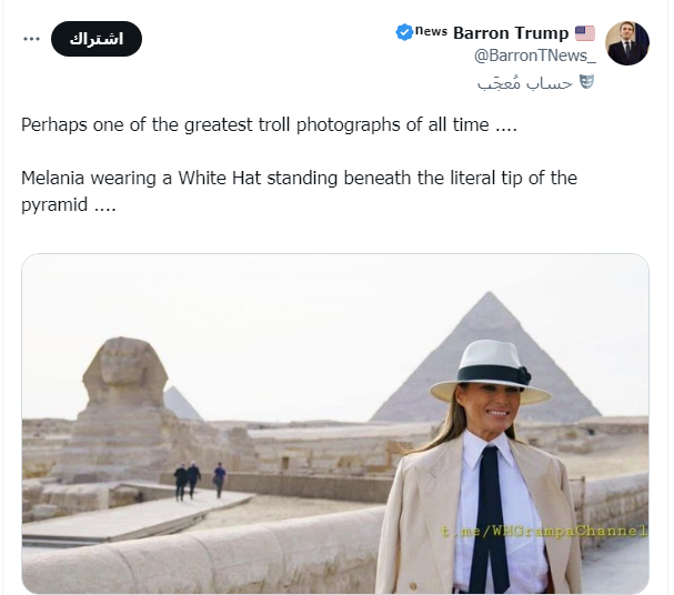 وقال بارون ترامب، عبر حسابه بمنصة "أكس"، عن صورة والدته ميلانيا في منطقة الأهرامات: "ربما تكون واحدة من أعظم صور الترول "الأسطورة" على مر العصور... ميلانيا ترتدي قبعة بيضاء وتقف تحت قمة الهرم حرفيًا..."