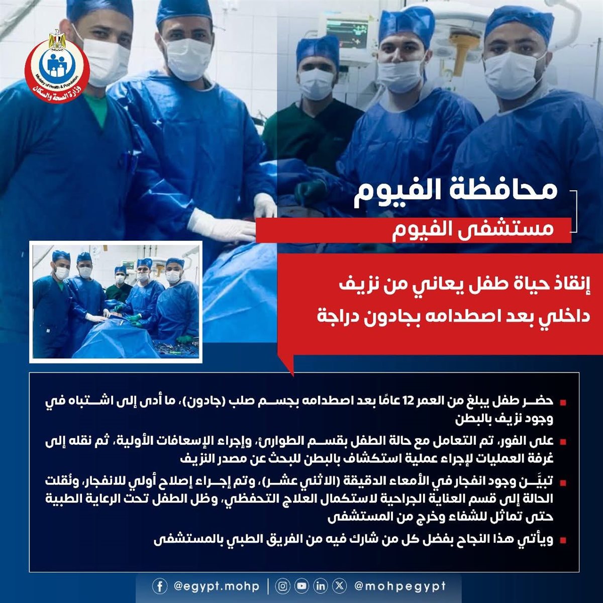 أعلنت وزارة الصحة عن نجاح فريق طبي بمستشفى الفيوم في إنقاذ طفل يعاني من نزيف داخلي بعد اصطدامه بجادون دراجة.