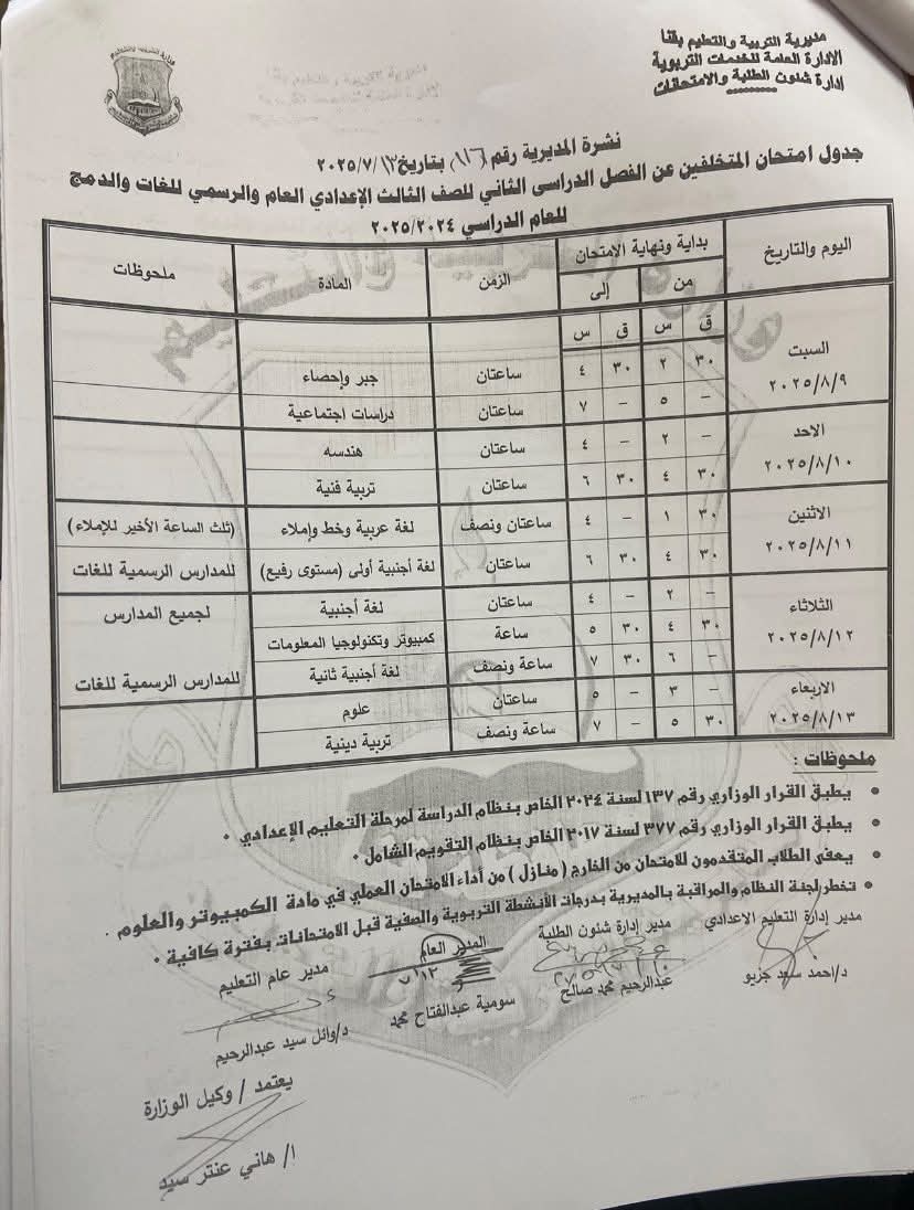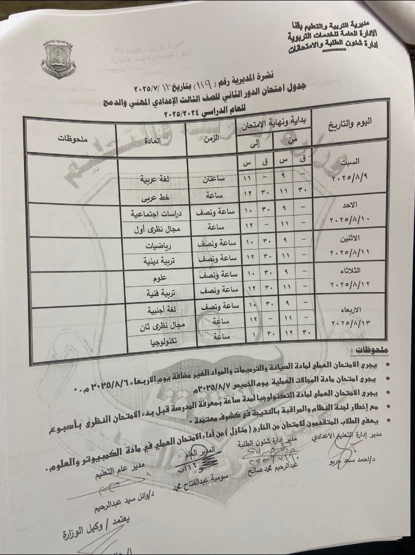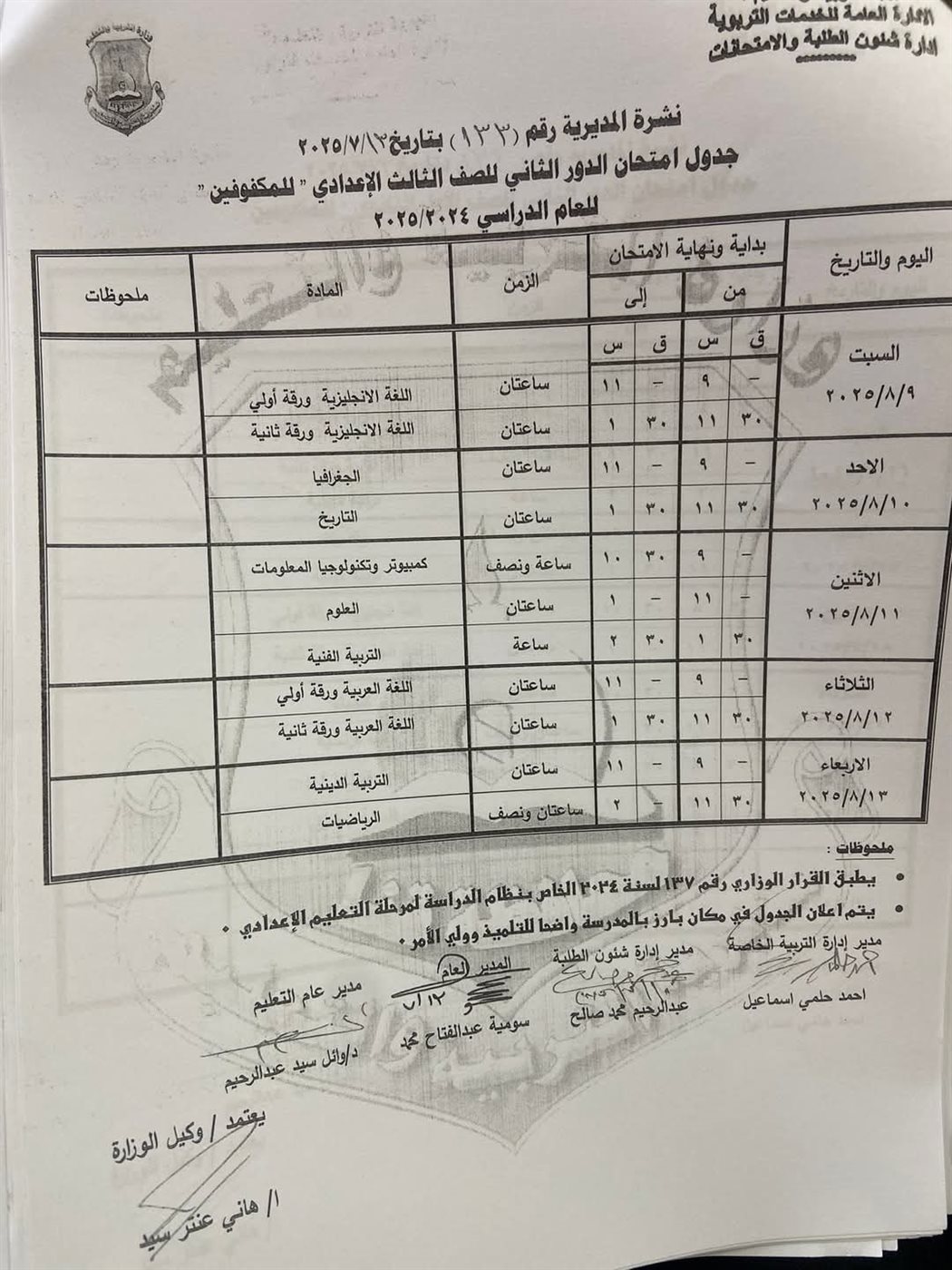في حين تبدأ امتحانات الصف الثالث الإعدادي ( عام، ومهني، ومكفوفين، وأمل) يوم السبت 9 أغسطس المقبل وحتى الأربعاء 13 أغسطس من نفس الشهر.