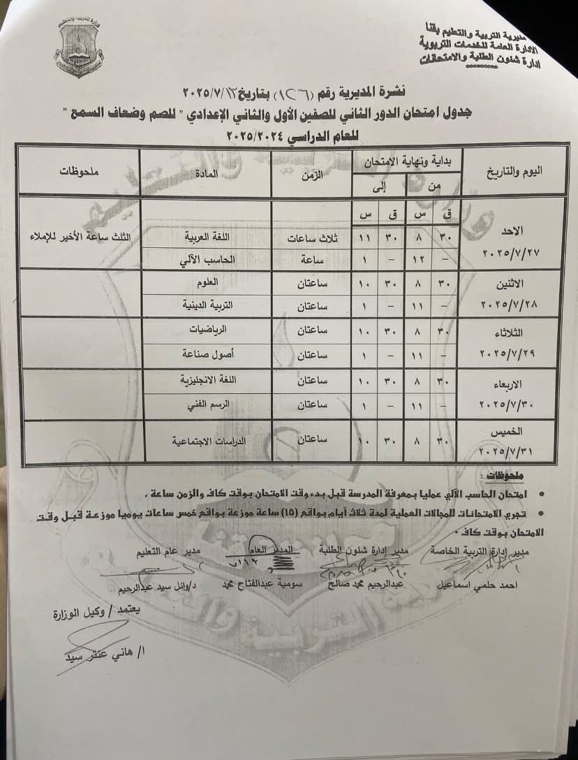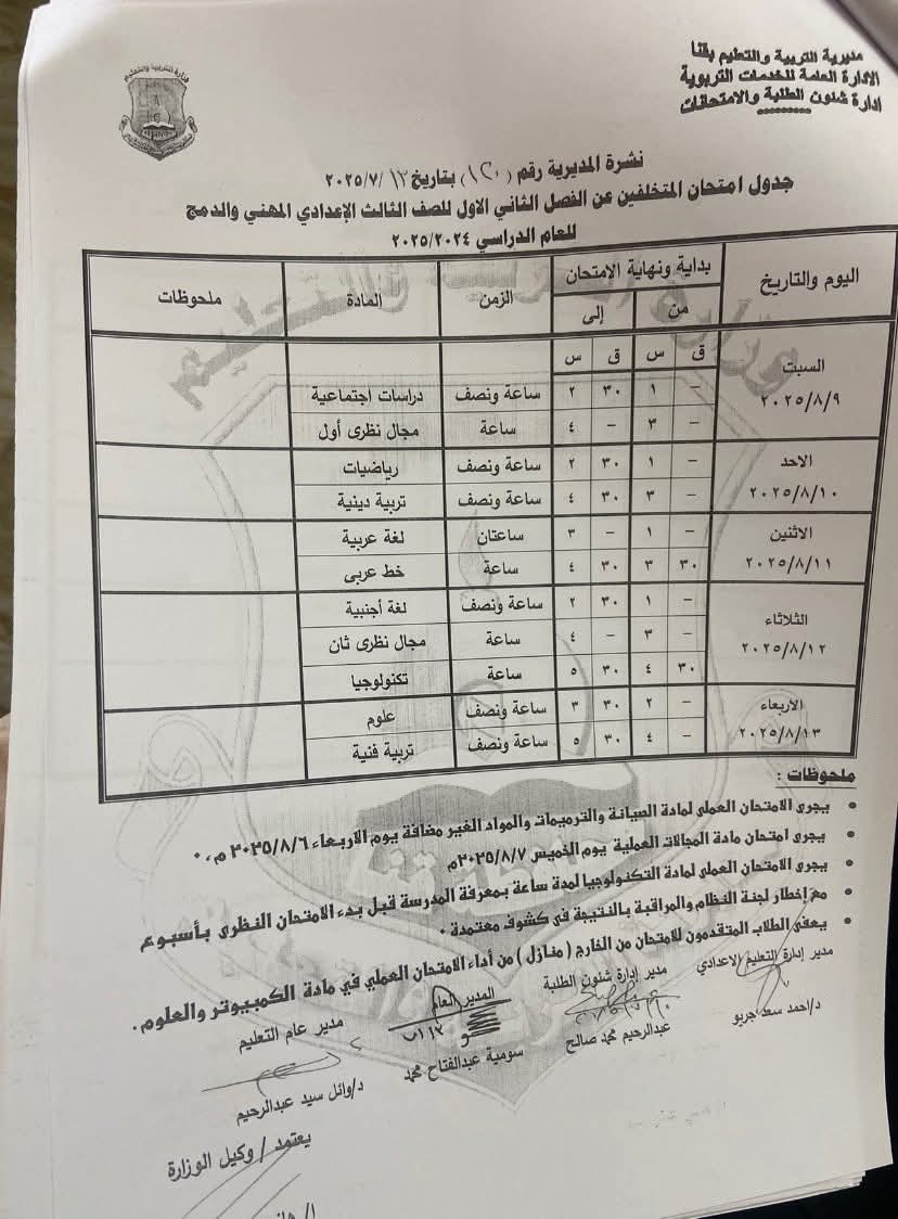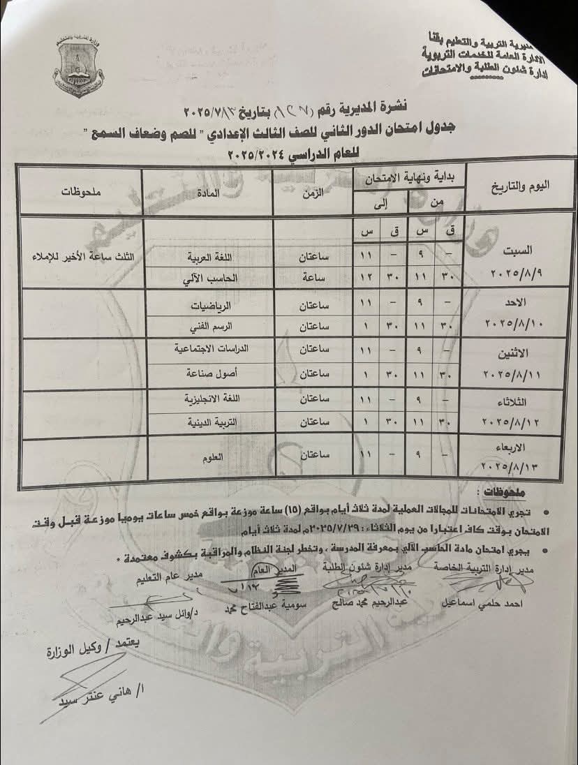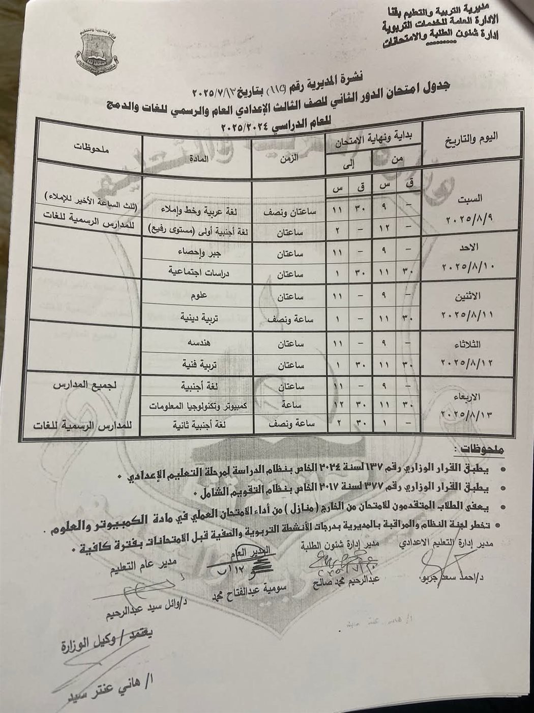 في حين تبدأ امتحانات الصف الثالث الإعدادي ( عام، ومهني، ومكفوفين، وأمل) يوم السبت 9 أغسطس المقبل وحتى الأربعاء 13 أغسطس من نفس الشهر.