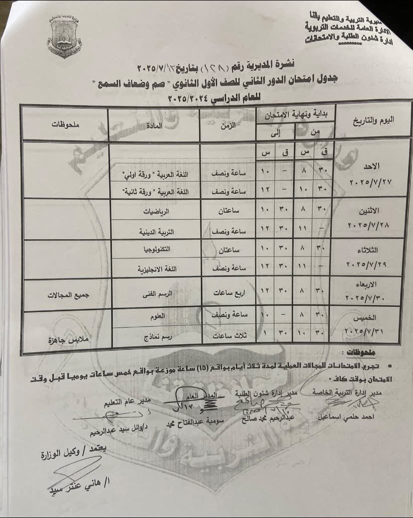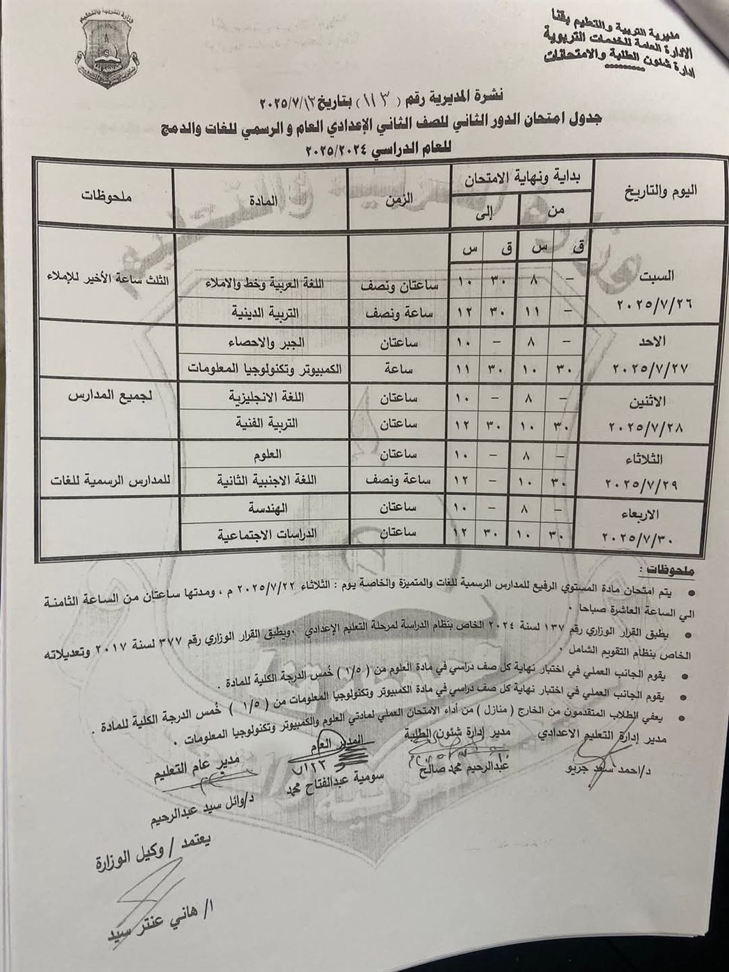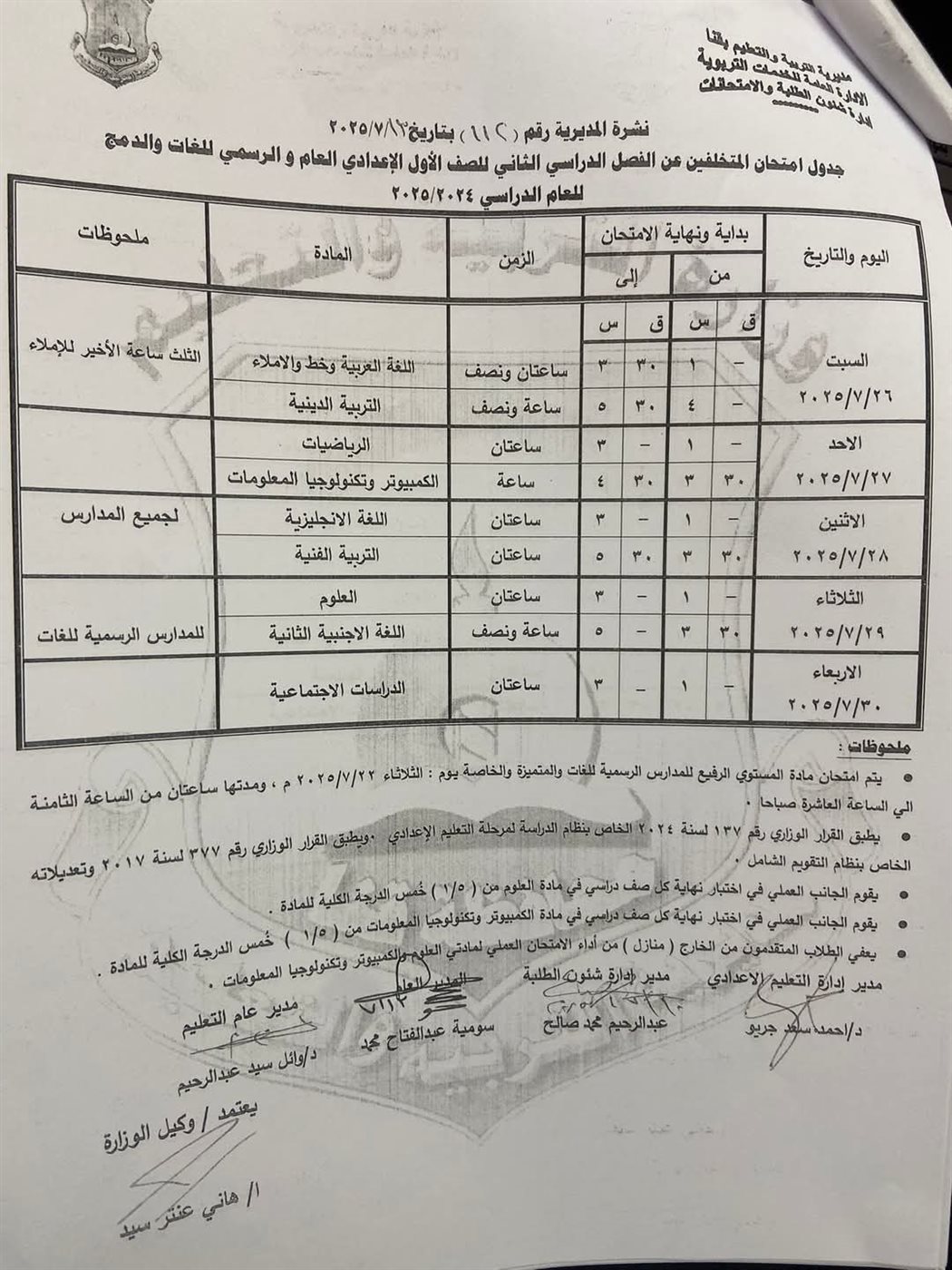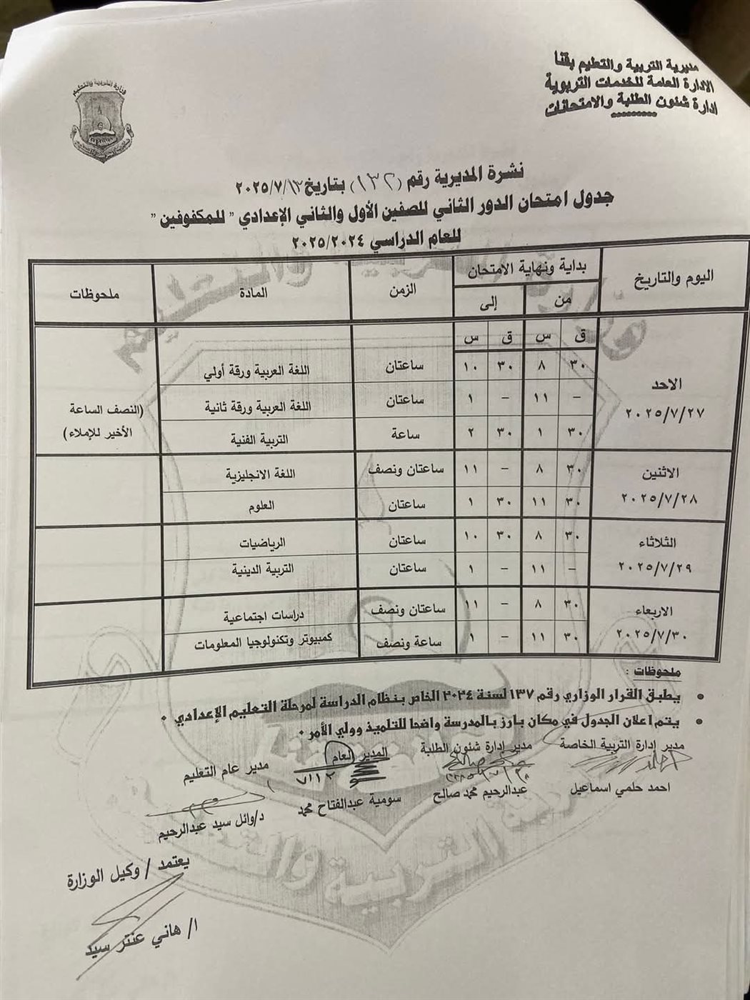 فيما تبدأ امتحانات الصفين الأول والثاني الثانوي العام في الفترة من السبت 26 يوليو وتستمر حتى الخميس 31 يوليو 2025م.