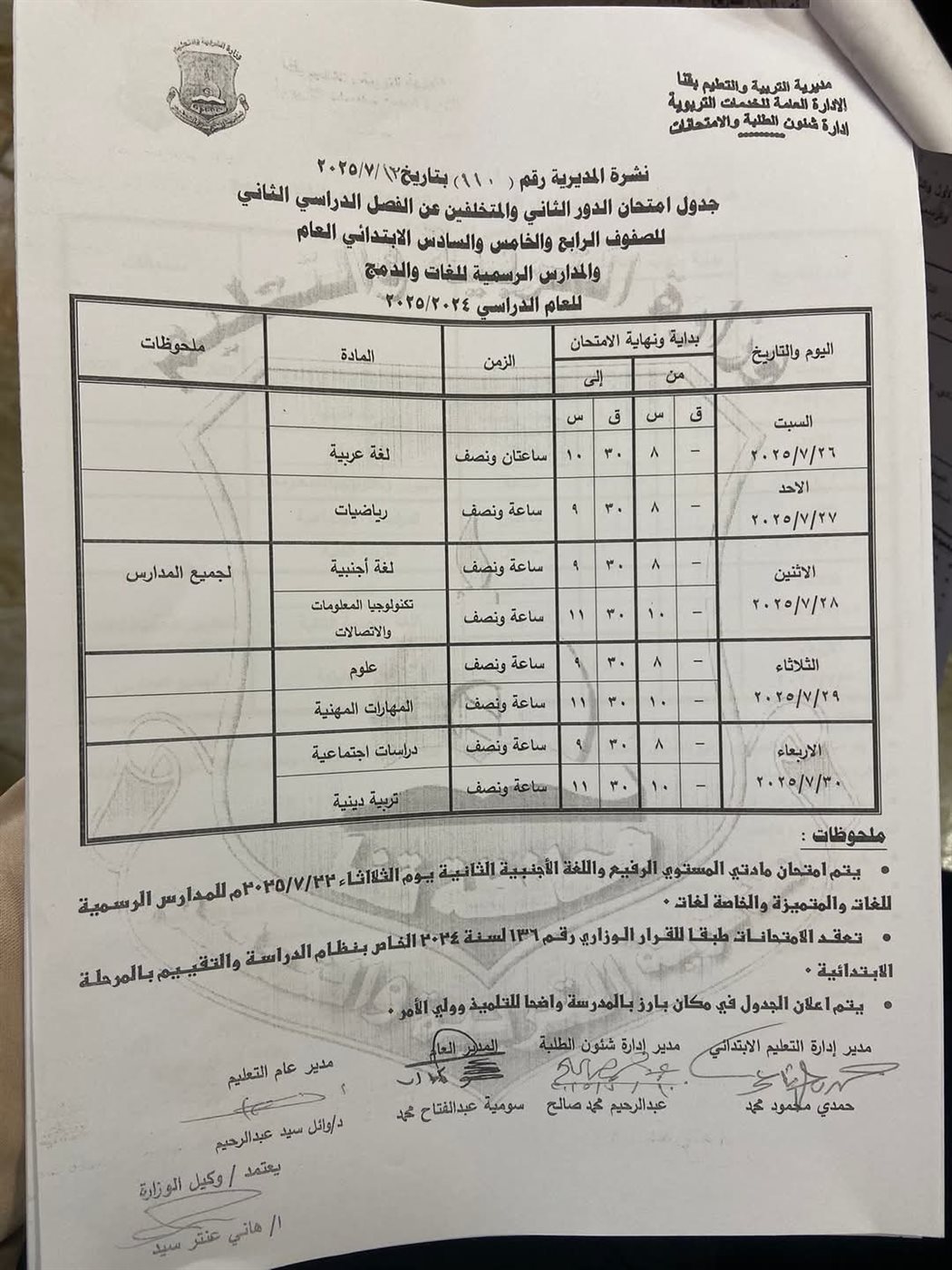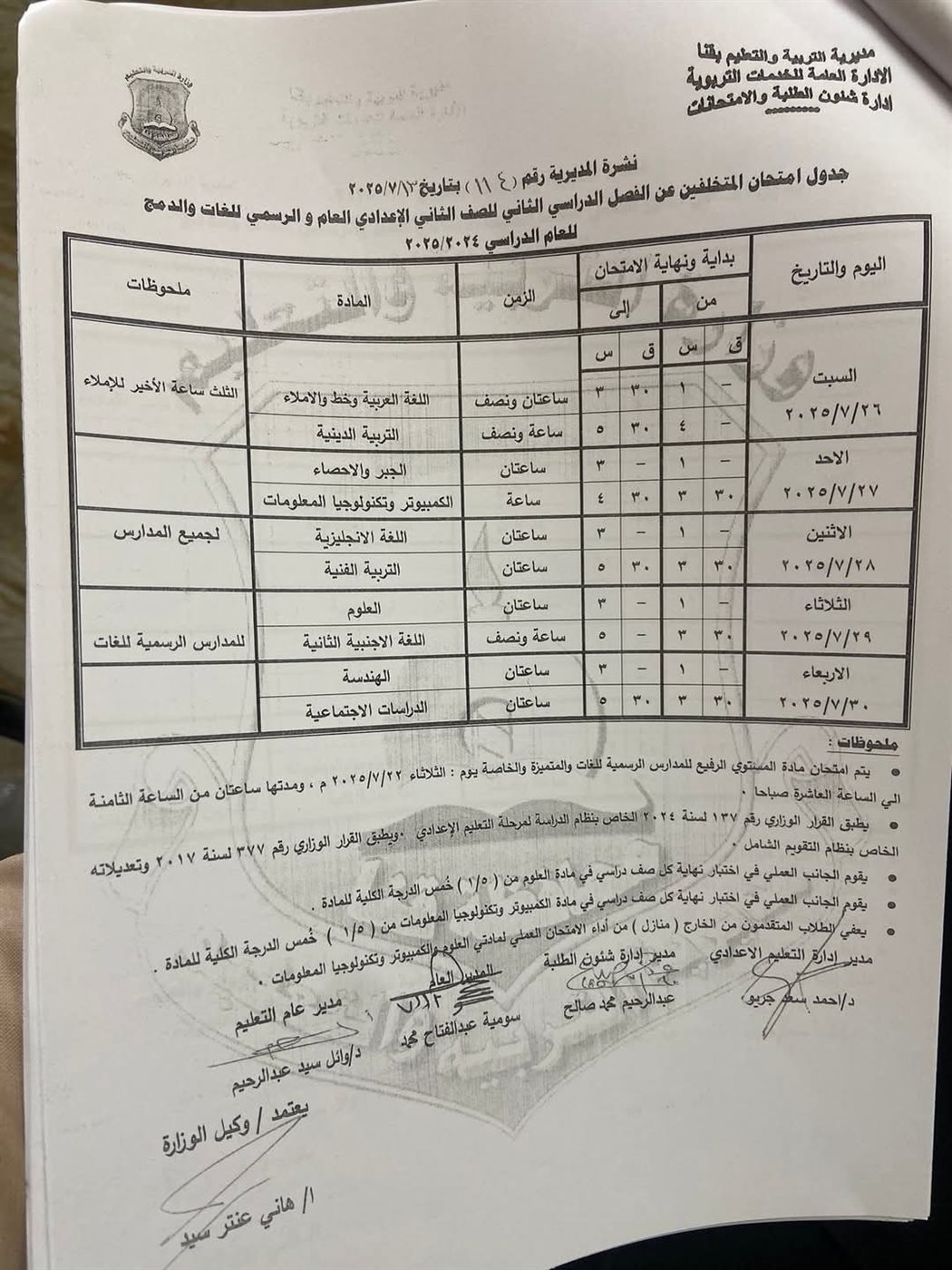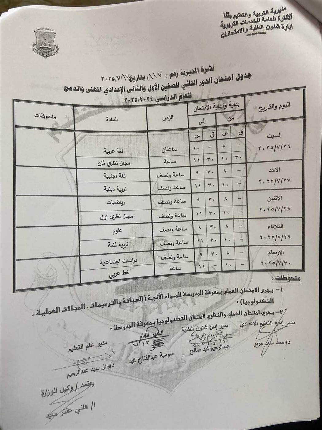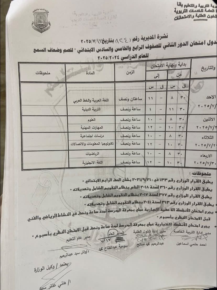 فيما تبدأ امتحانات الصفين الأول والثاني الثانوي العام في الفترة من السبت 26 يوليو وتستمر حتى الخميس 31 يوليو 2025م.