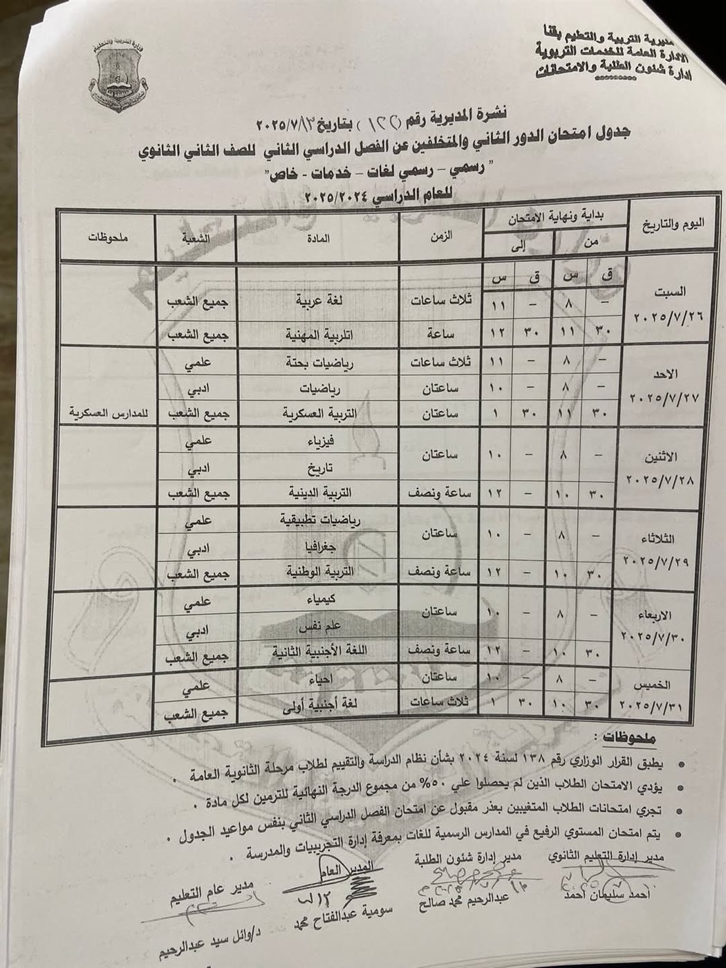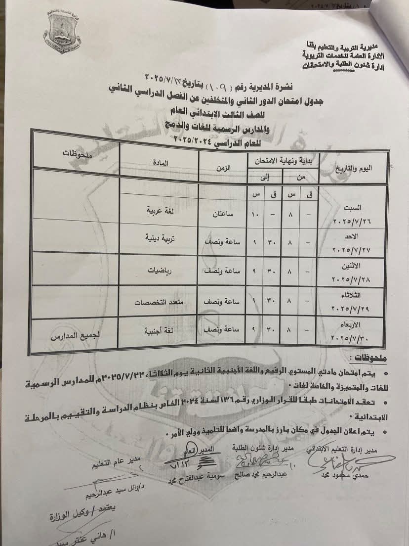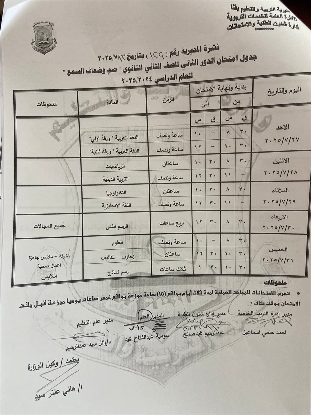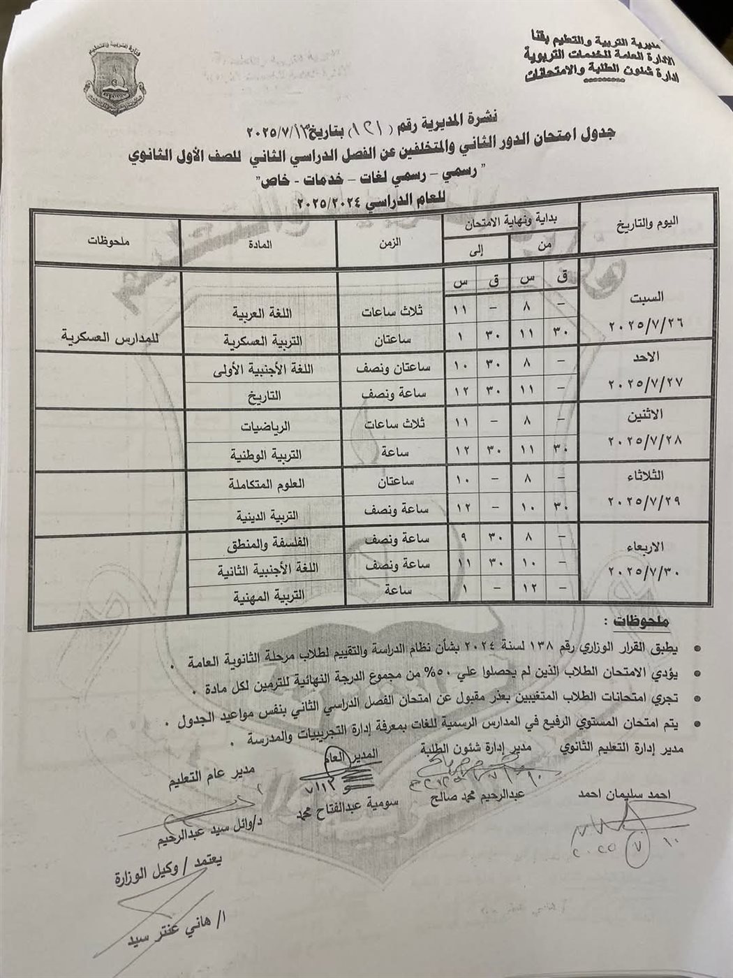 فيما تبدأ امتحانات الصفين الأول والثاني الثانوي العام في الفترة من السبت 26 يوليو وتستمر حتى الخميس 31 يوليو 2025م.