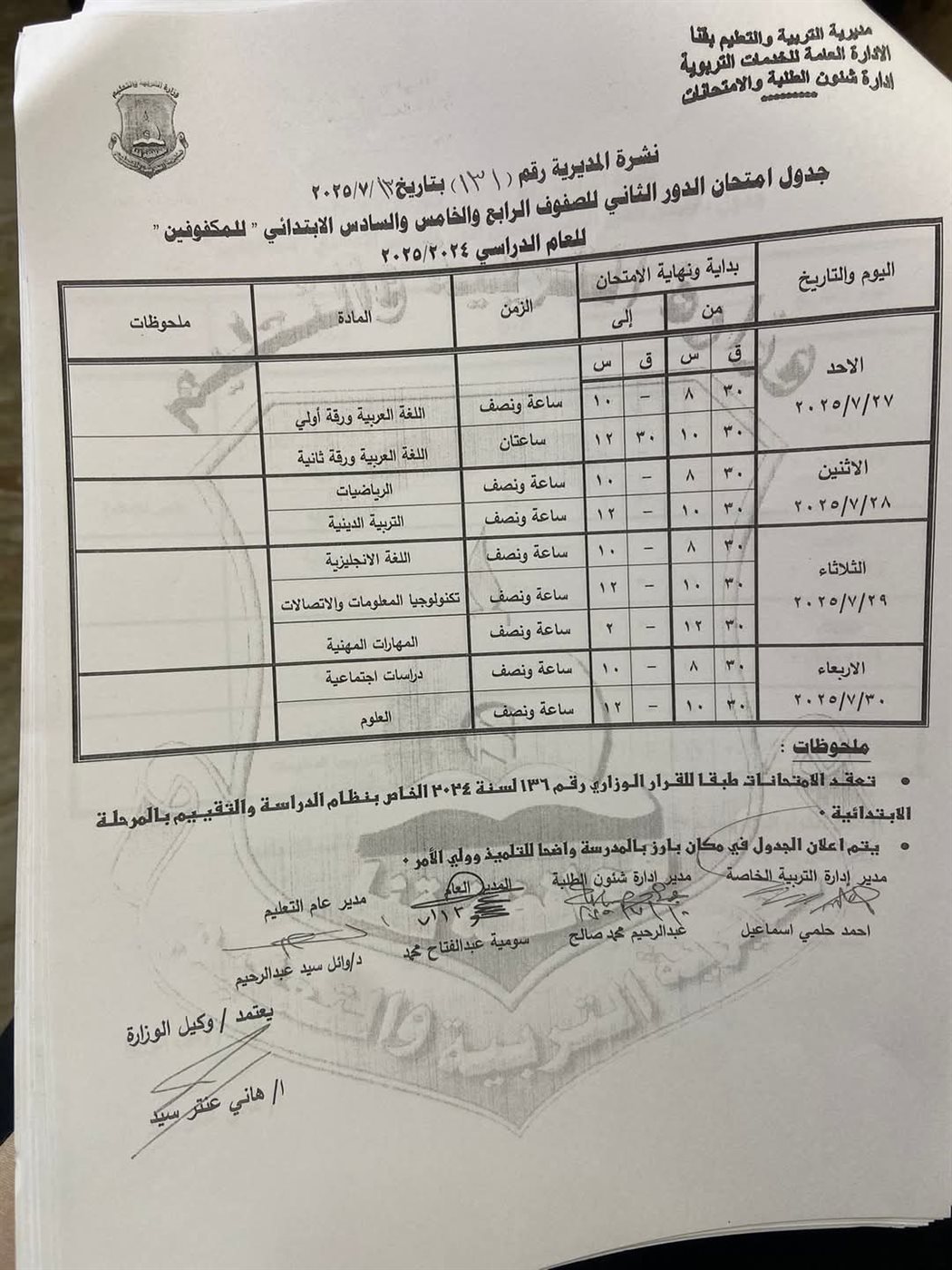 اعتمد هاني عنتر الصابر وكيل وزارة التربية والتعليم بمحافظة قنا اليوم الإثنين جداول امتحانات الدور الثاني لصفوف النقل بالمراحل الابتدائية والإعدادية والثانوية ومدارس التربية الخاصة والتعليم المجتمعي للعام الدراسي 2024- 2025.