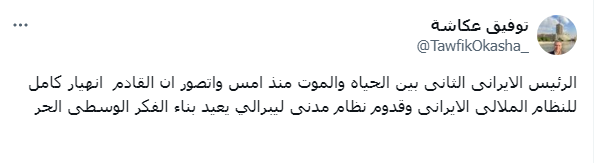 وزعم توفيق عكاشة أن الرئيس الإيراني مسعود بزشيكيان بين الحياة والموت منذ أمس، مدعيًا انهيار كامل للنظام الإيراني في المرحلة المقبلة، وأن هناك نظاما مدنيا ليبراليا يخلف نظام ولاية الفقيه.