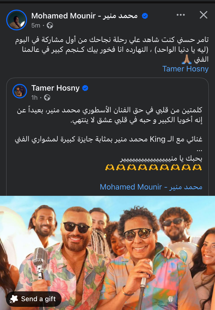 وكتب محمد منير قائلا: “تامر حسني كنت شاهدا علي رحلة نجاحك من أول مشاركة في ألبوم (ليه يا دنيا الواحد).. النهارده أنا فخور بيك كـنجم كبير في عالمنا الفني”.