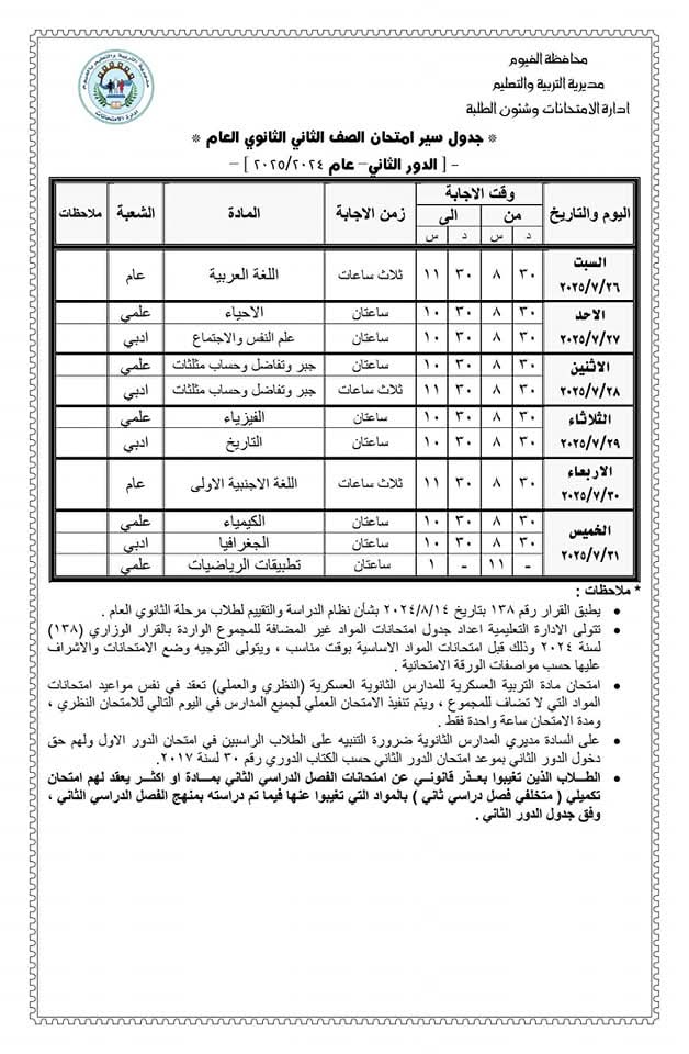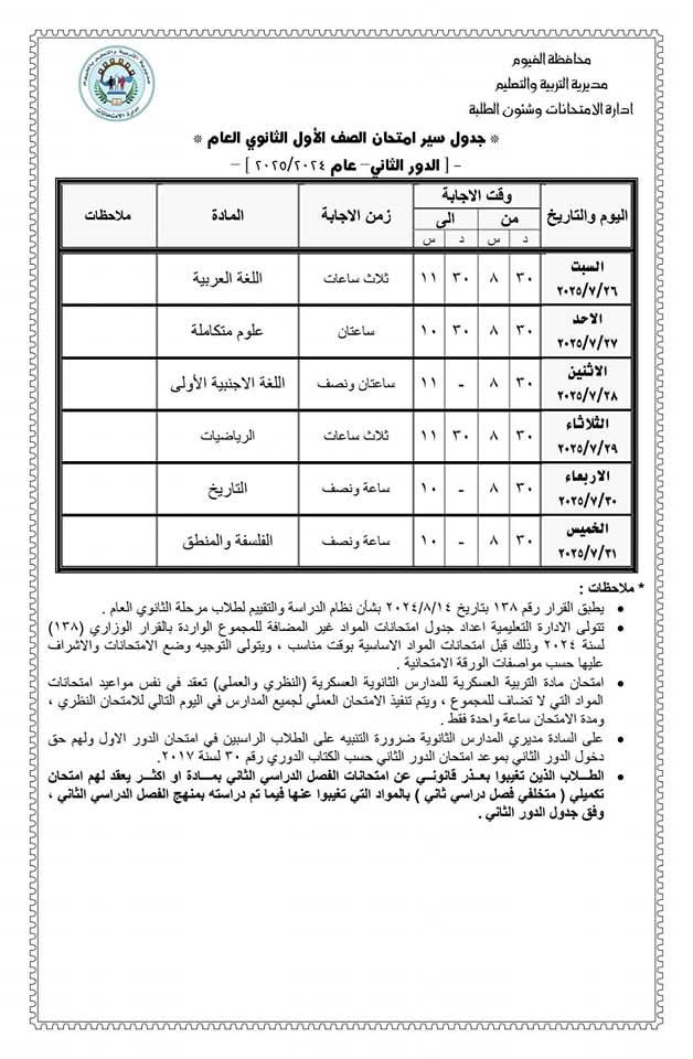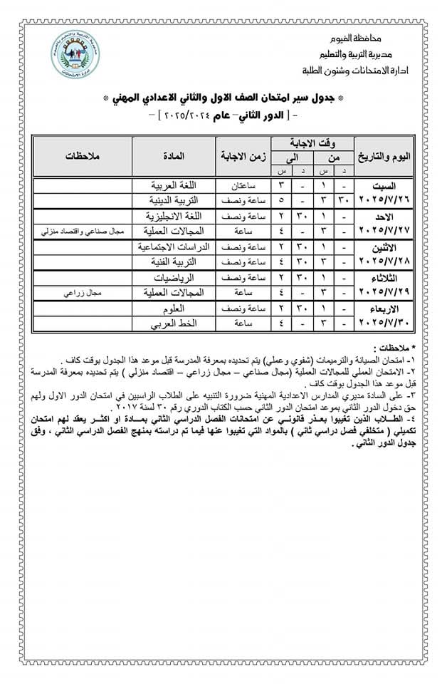 محافظ الفيوم يعتمد جدول امتحانات الدور الثاني لصفوف النقل والشهادة الإعدادية