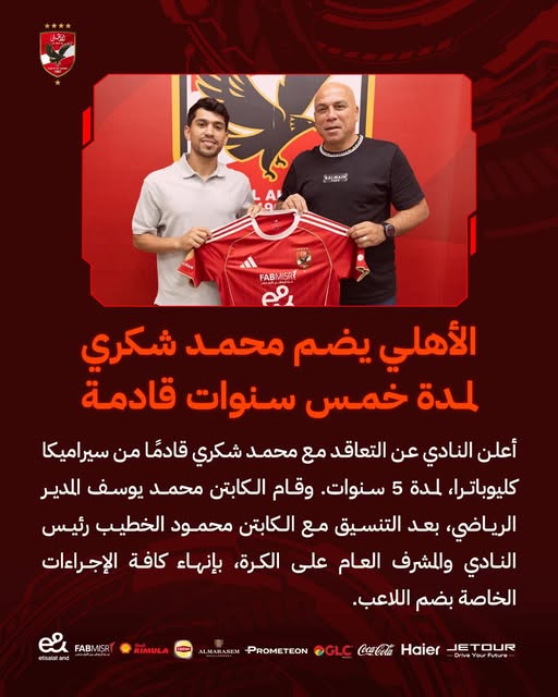 أعلن النادي الأهلي في بيان رسمي، تعاقده مع محمد شكري، قادما من نادي سيراميكا كيلوباترا، لمدة 5 سنوات، لتدعيم خط دفاع المارد الأحمر، خلال الميركاتو الصيفي الجاري.