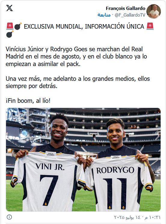 وأكد الإعلامي الإسباني فرانسوا جالاردو عبر حسابه الرسمي بمنصة إكس أن ثنائي ريال مدريد الإسباني فينيسيوس جونيور ورودريجو سيرحلان في شهر أغسطس المقبل.