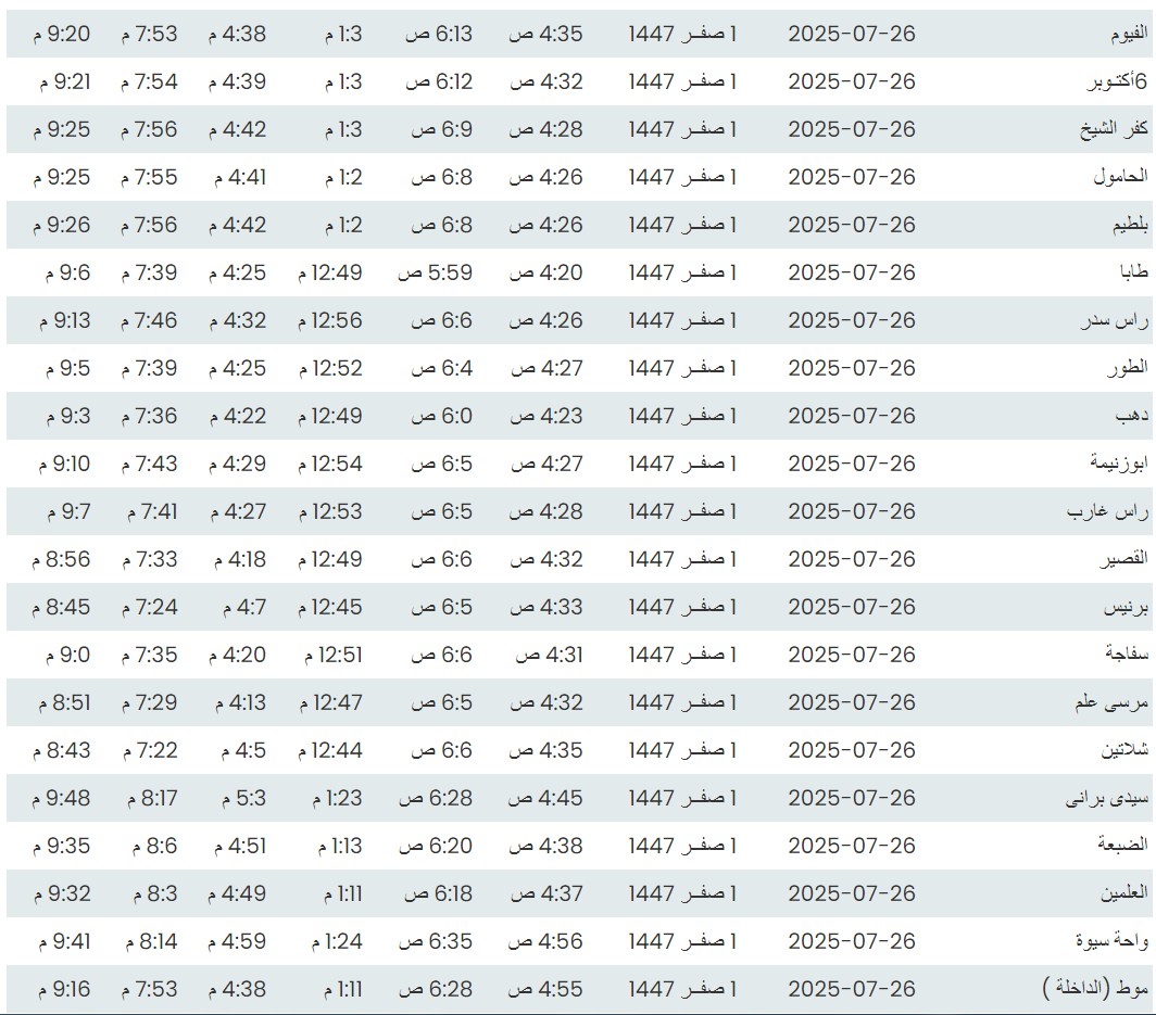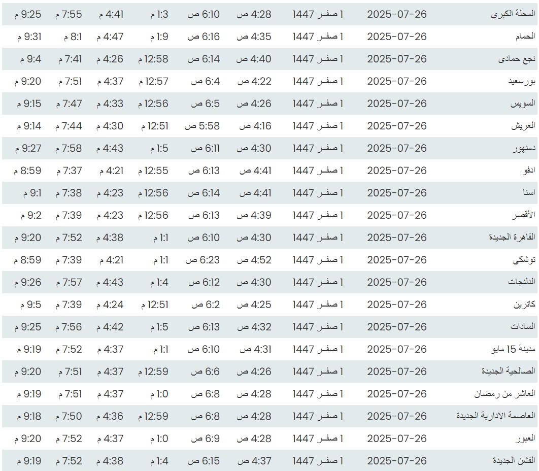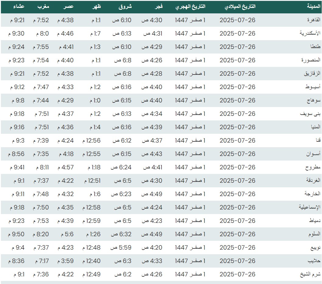 وفيما يلي مواقيت الصلاة، لعدد من مدن ومحافظات الجمهورية من واقع بيانات الهيئة العامة للمساحة