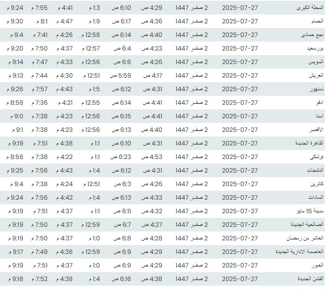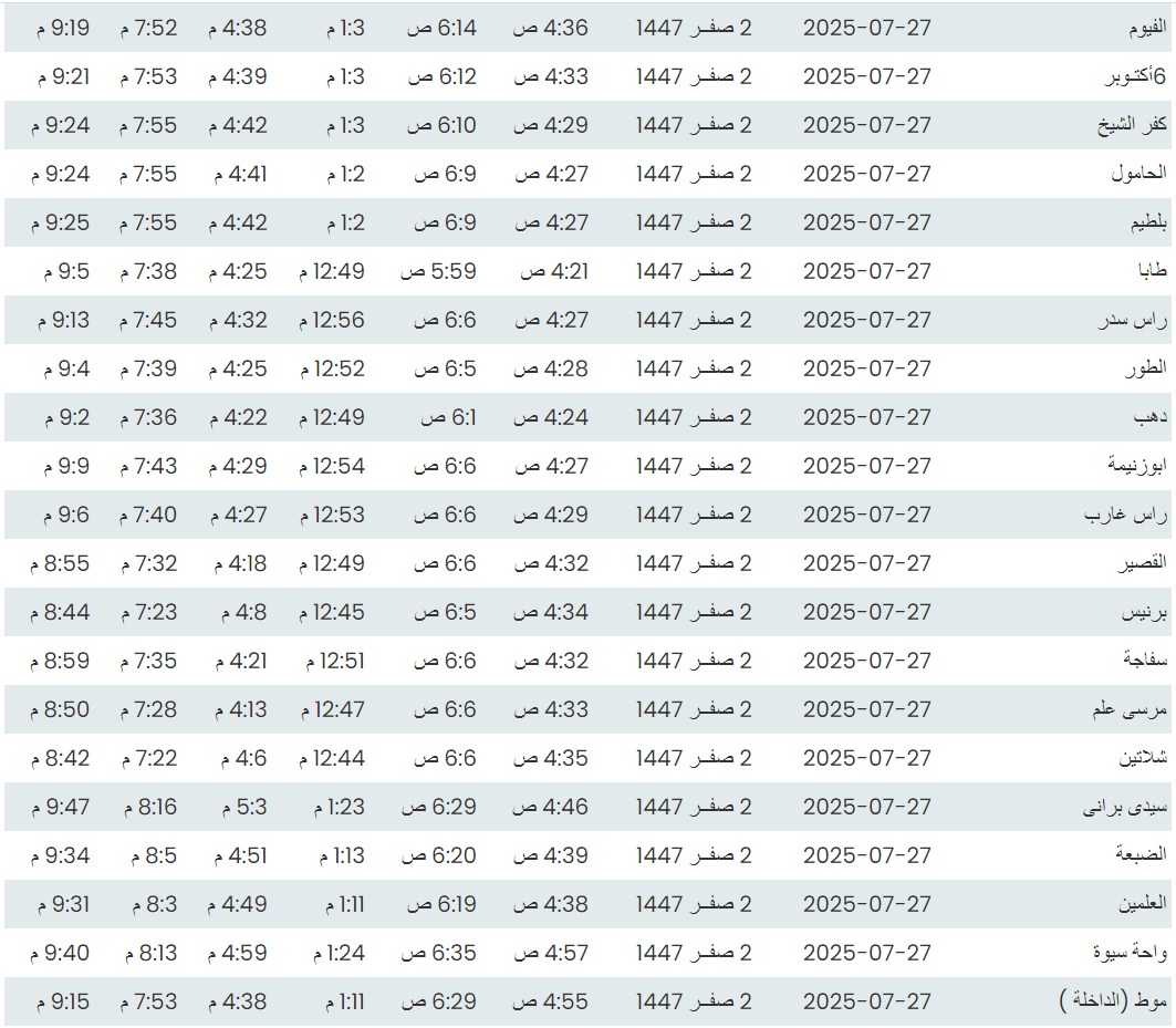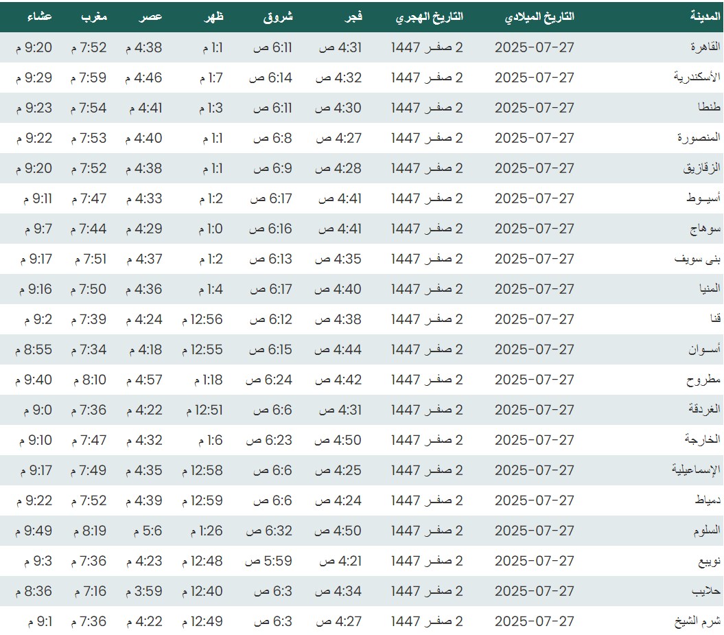 وفيما يلي مواقيت الصلاة، لعدد من مدن ومحافظات الجمهورية من واقع بيانات الهيئة العامة للمساحة