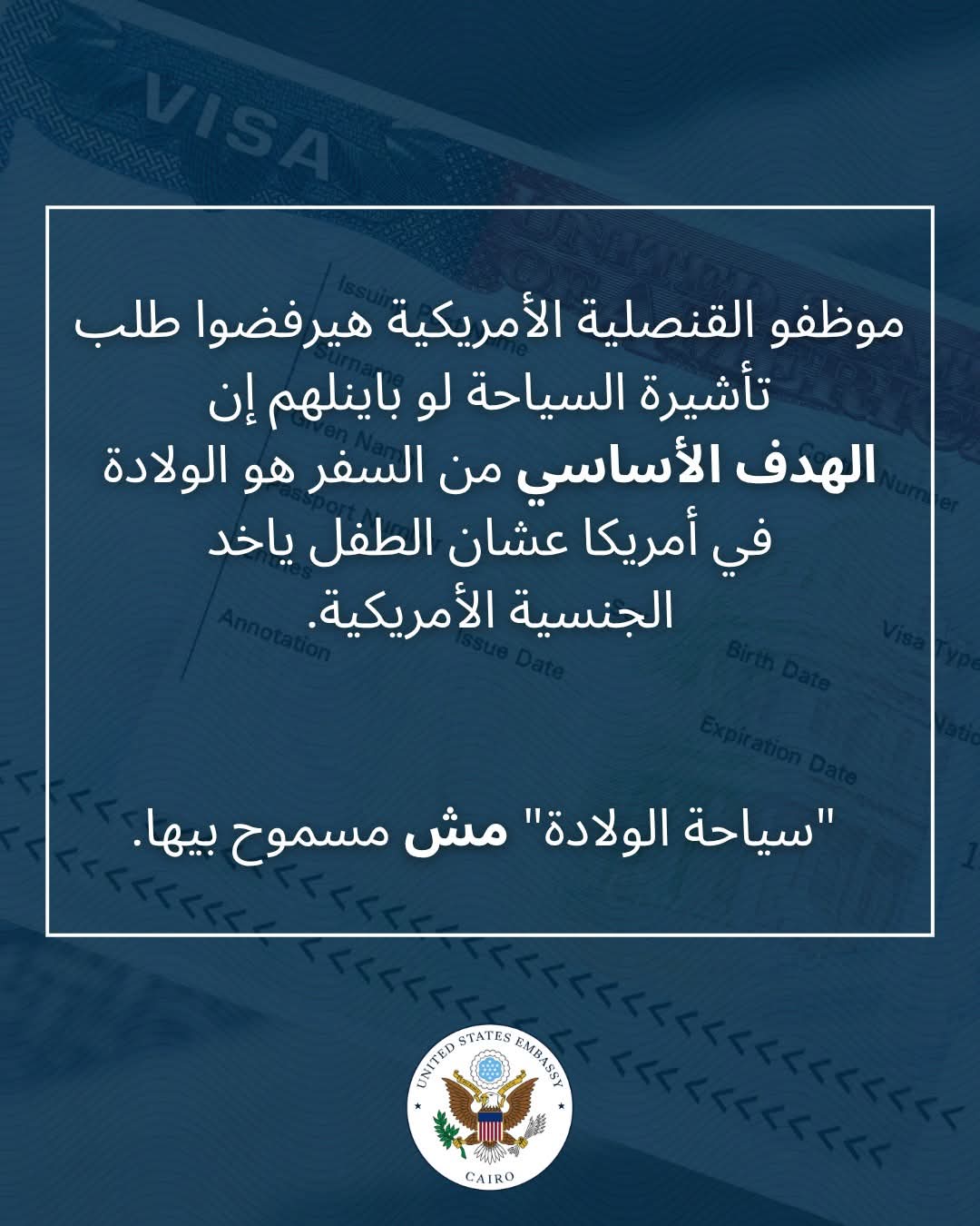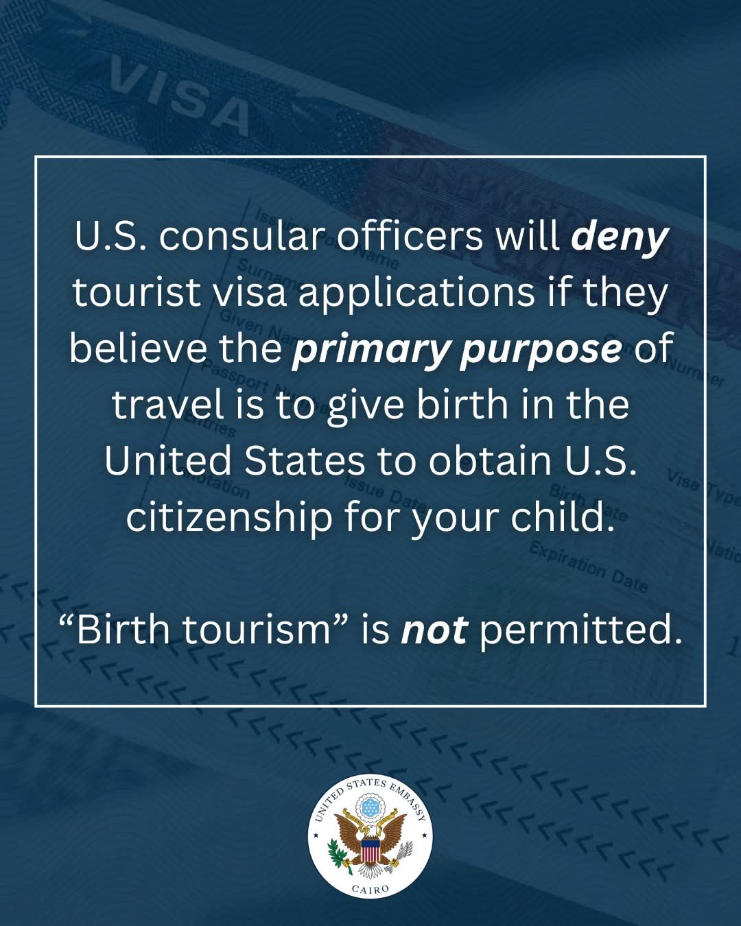 وكتبت السفارة الأمريكية علي صفحتها علي موقع التواصل الاجتماعي فيس بوك:"موظفو القنصلية الأمريكية لن يقبلوا مجددا طلب تأشيرة السياحة للولادة، حال تبين لهم إن الهدف الأساسي من السفر هو الولادة في أمريكا حتى يتمكن الطفل من نيل الجنسية الأمريكية، مشددة على أن سياحة الولادة غير مسموح بها".