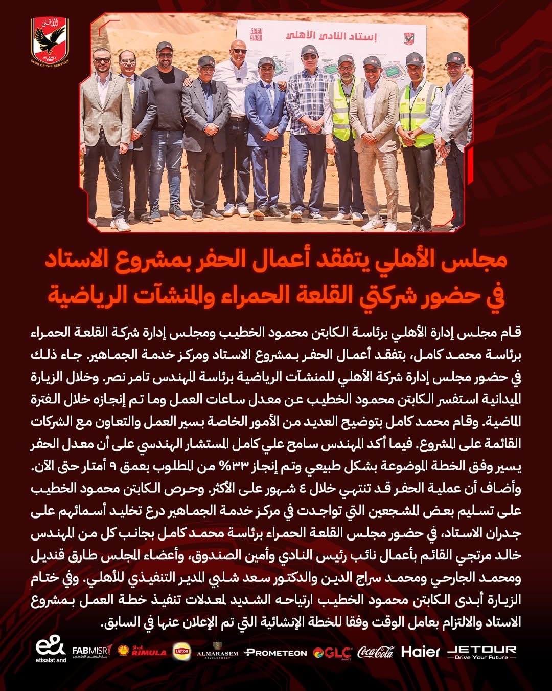 قام مجلس إدارة الأهلي برئاسة الكابتن محمود الخطيب ومجلس إدارة شركة القلعة الحمراء برئاسة محمـد كامل، بتفقد أعمال الحفر بمشروع الاستاد ومركز خدمة الجماهير.