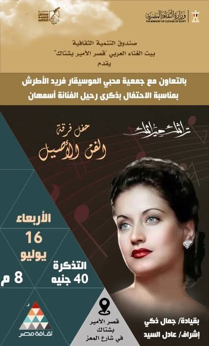 الحفل يقام في ذكرى رحيل الفنانة اسمهان، بالتعاون مع جمعية محبى الموسيقار فريد الأطرش برئاسة عادل السيد.
