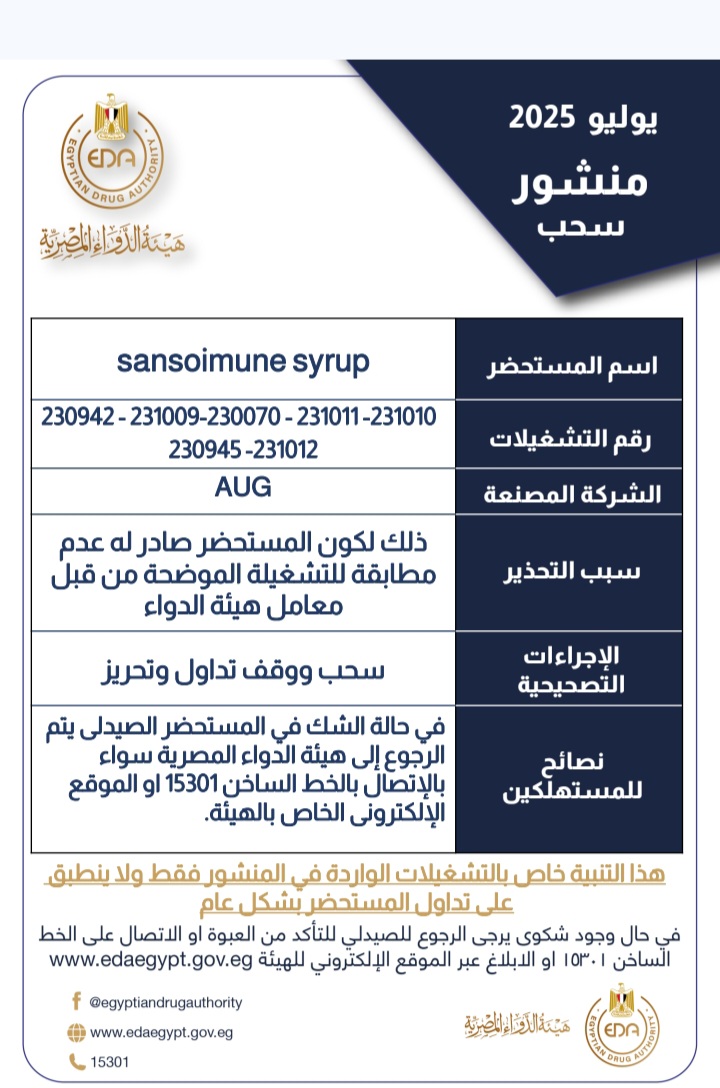 قررت هيئة الدواء المصرية سحب عدة تشغيلات من المستحضر الدوائي Sansoimune Syrup من الأسواق، وذلك بعد ثبوت عدم مطابقة بعض التشغيلات للمواصفات الفنية التي تم تحديدها من قبل معامل الهيئة، ما قد يؤثر على فعالية وجودة الدواء.