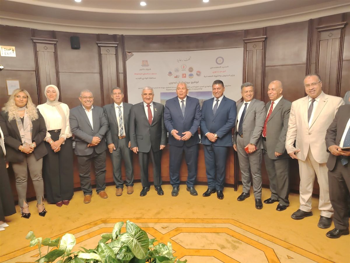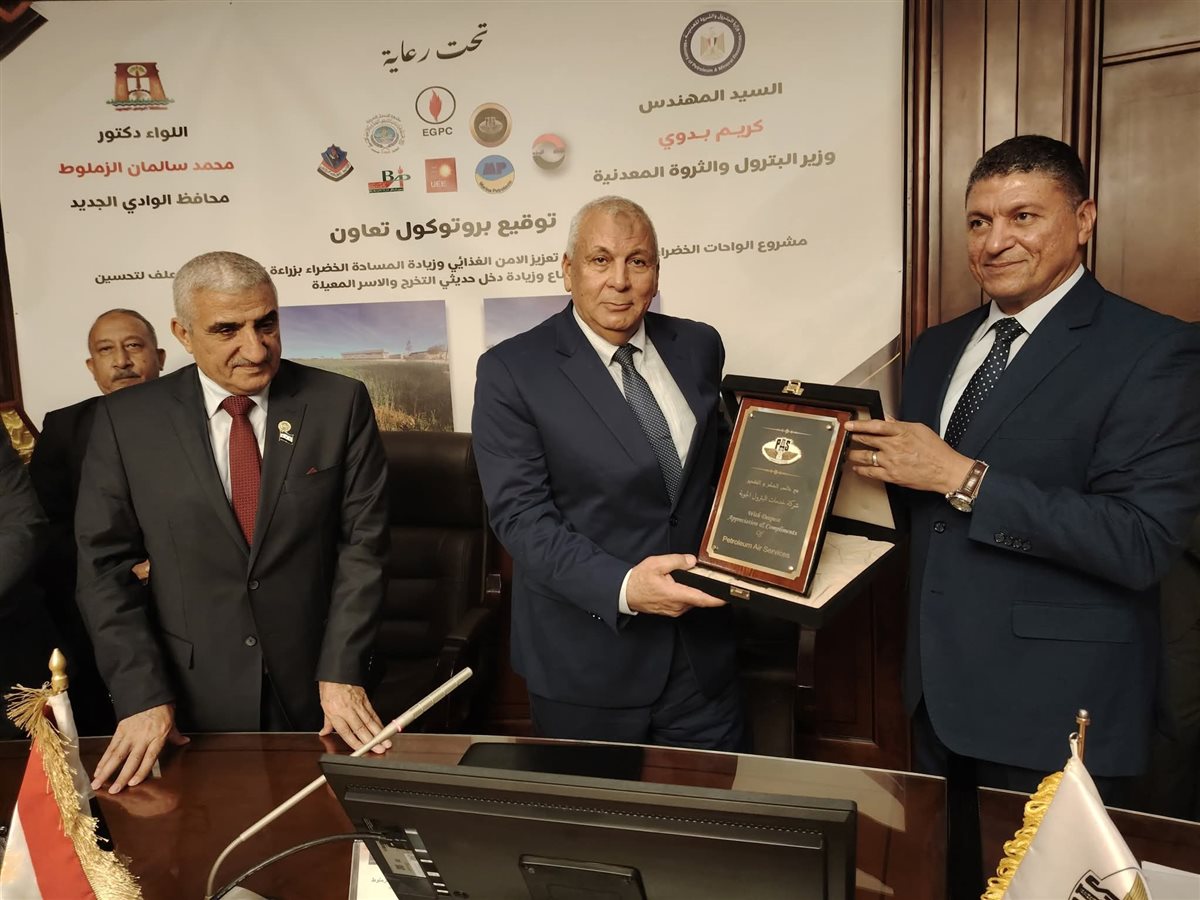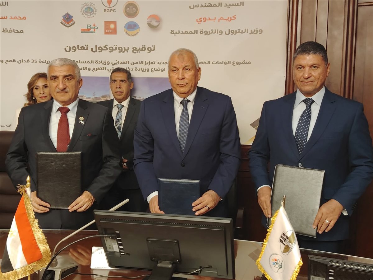 وقّع اللواء دكتور محمد الزملوط محافظ الوادي الجديد، واللواء طيار إيهاب عبد المقصود رئيس مجلس إدارة شركة خدمات البترول الجوية، والدكتور نصر الدين عبيد مدير عام المركز العربي لدراسات المناطق الجافة والأراضي القاحلة (أكساد)، اتفاقية تعاون لتنفيذ مشروع "الواحات الخضراء " لاستصلاح وزراعة 35 فدانًا من محصول القمح كمرحلة أولى، وفقًا لأحدث الأساليب العلمية والتقنيات الزراعية المستدامة، بحضور الدكتور مجد المرسي وكيل وزارة الزراعة بالمحافظة، والعقيد وليد النادي مدير مكتب المحافظ.