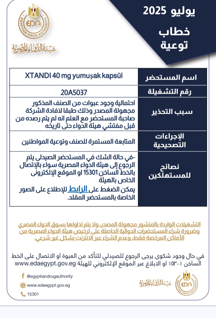 أصدرت هيئة الدواء المصرية خطاب توعية بشأن مستحضر XTANDI 40 mg kapsul، رقم التشغيلة 20A5037، وذلك لوجود احتمالية تداول عبوات مجهولة المصدر من هذا الصنف، بحسب ما أفادت به الشركة صاحبة المستحضر، دون أن يتم رصده من قبل مفتشي الهيئة حتى تاريخه.