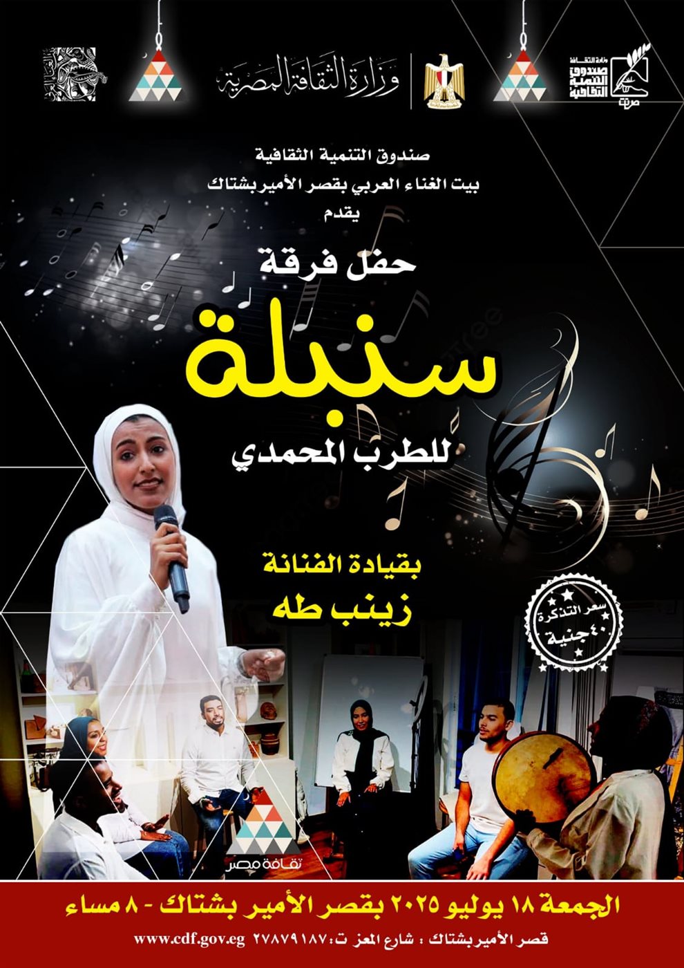 ينظم قطاع صندوق التنمية الثقافية، من خلال بيت الغناء العربي حفلًا فنيًا لفرقة "سنبلة" للطرب المحمدي بقيادة الفنانة زينب طه، بقصر الأمير بشتاك، وذلك في الثامنة من مساء الجمعة الموافق 18 يوليو، بمقر القصر بشارع المعز.