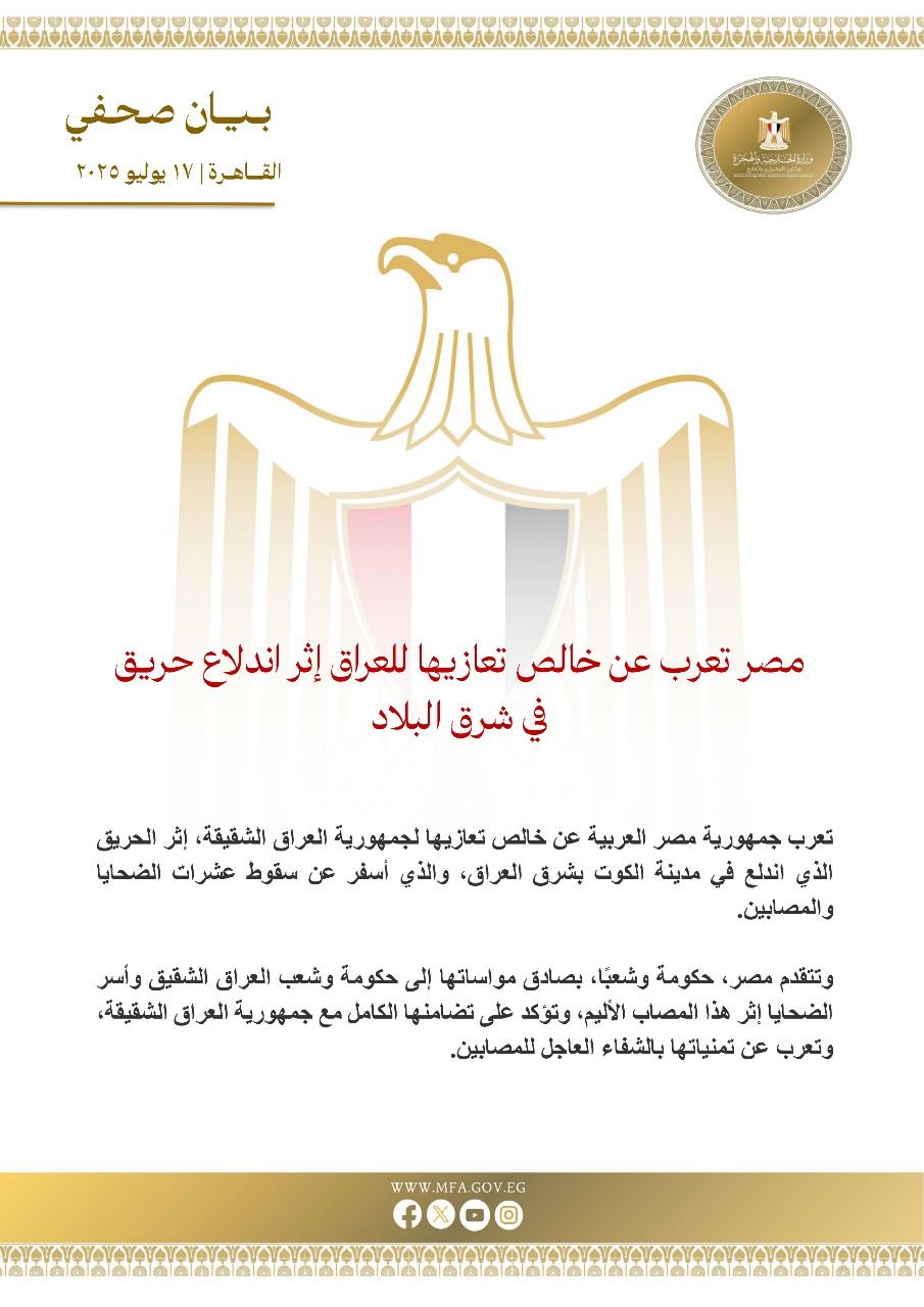 أعربت جمهورية مصر العربية عن خالص تعازيها لجمهورية العراق الشقيقة، إثر الحريق الذي اندلع في مدينة الكوت بشرق العراق، والذي أسفر عن سقوط عشرات الضحايا والمصابين.