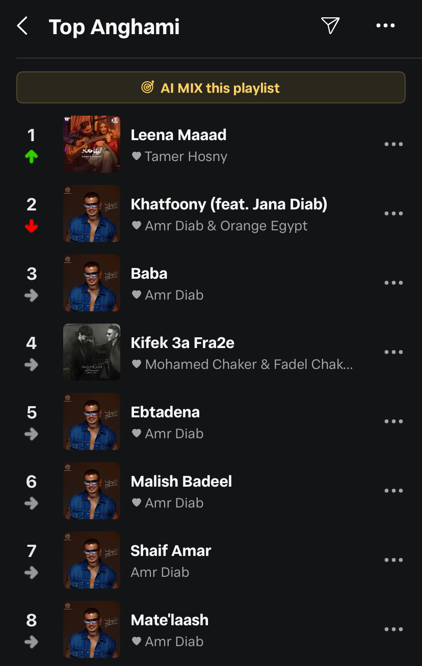 أزاحت أغنية “لينا معاد” للفنان تامر حسني من ألبومه الجديد الذي يحمل نفس الاسم، أغنية “خطفوني” للنجم عمرو دياب رفقة ابنته “جنا” من صدارة تريند منصة “أنغامي” الرقمية.