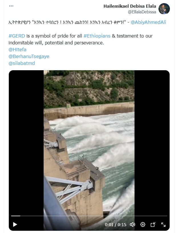 وقام الدبلوماسي الإثيوبي ببث مقطع الفيديو الزائف عن سد النهضة ووجهه لكل من رئيس الوزراء آبي أحمد قائلًا: "الإثيوبيون "معًا! معًا! معًا!" أبي أحمد.. سد النهضة الإثيوبي الكبير رمزٌ للفخر لجميع الإثيوبيين، وشهادةٌ على إرادتنا الراسخة، وإمكانياتنا، ومثابرتنا".
