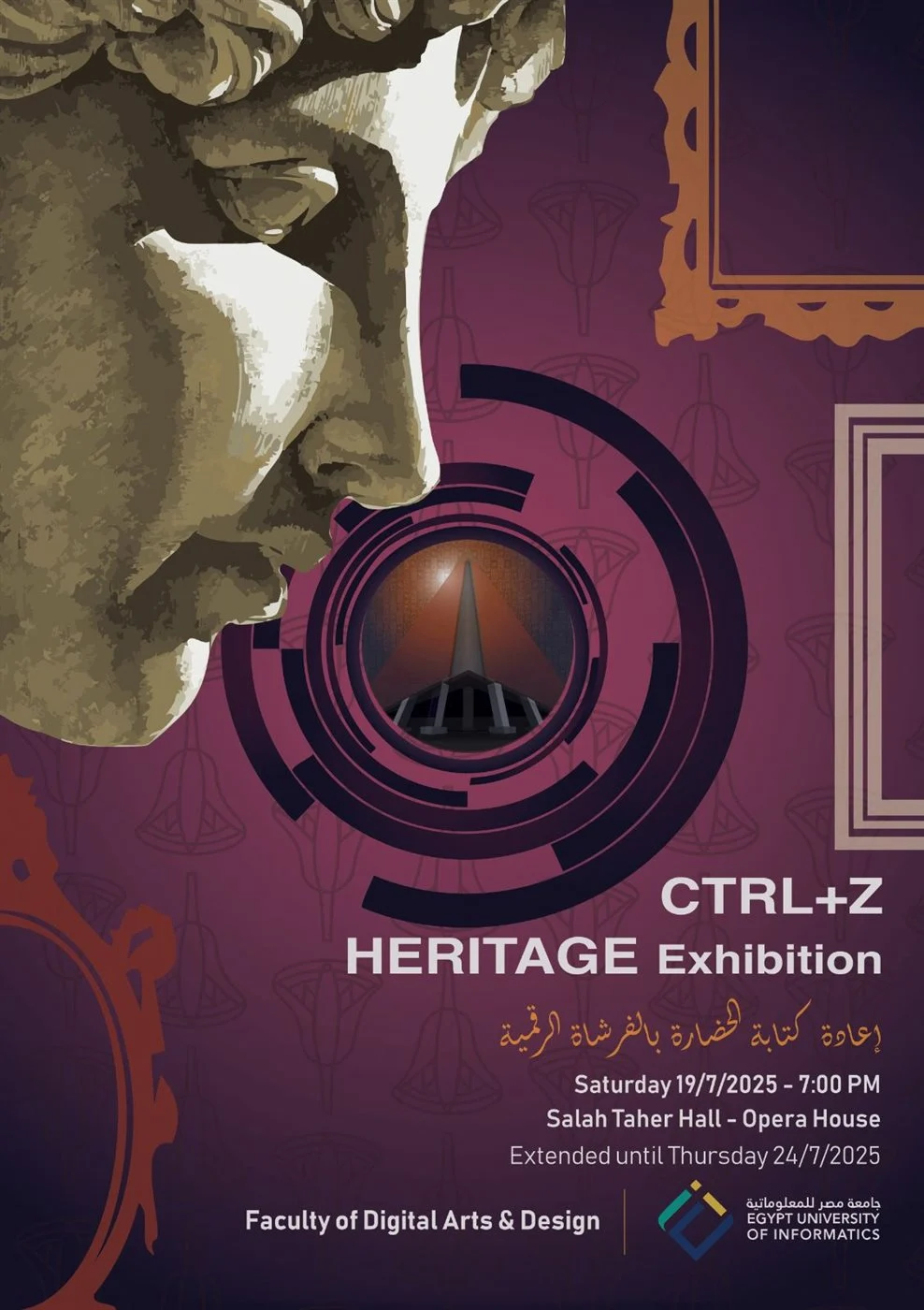 تفتتح جامعة مصر للمعلوماتية السبت المقبل، بمقر دار الأوبرا المصرية، حيث يلتقي عبق التاريخ مع نبض الإبداع المعاصر، معرض "عودة للتراث " Ctrl+z تحت شعار "إعادة كتابة الحضارة بالفرشاة الرقمية، ليُجسد لقاء الفن بالتكنولوجيا، والتعبير الإنساني بالابتكار الرقمي، وتنظمه كلية الفنون الرقمية والتصميم - جامعة مصر للمعلوماتية، تحت رعاية وزارة الاتصالات وتكنولوجيا المعلومات، في قاعة صلاح طاهر.