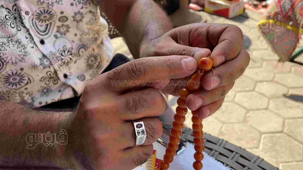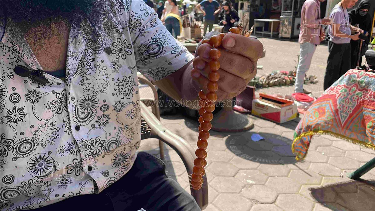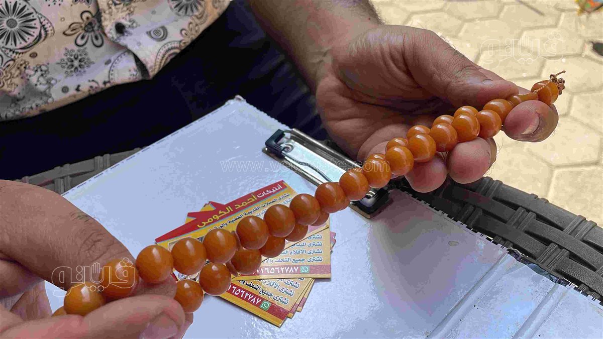 على أحد المقاهي المنتشرة في السوق، يجلس أحد هواة وتجار المقتنيات القديمة، ممسكًا بيده سبحة برتقالية اللون، لامعة، ويبدأ في سرد حكايتها التي تعود إلى عشرينيات القرن الماضي. يقول: "هذه السبح ليست مجرد خرز، إنها قصة كبيرة وممتعة جدًا. في حوالي عام 1920، اخترع الألمان مادة فريدة مقاومة للحرارة والنار، ولها رائحة عطرية مميزة تشبه الصنوبر".