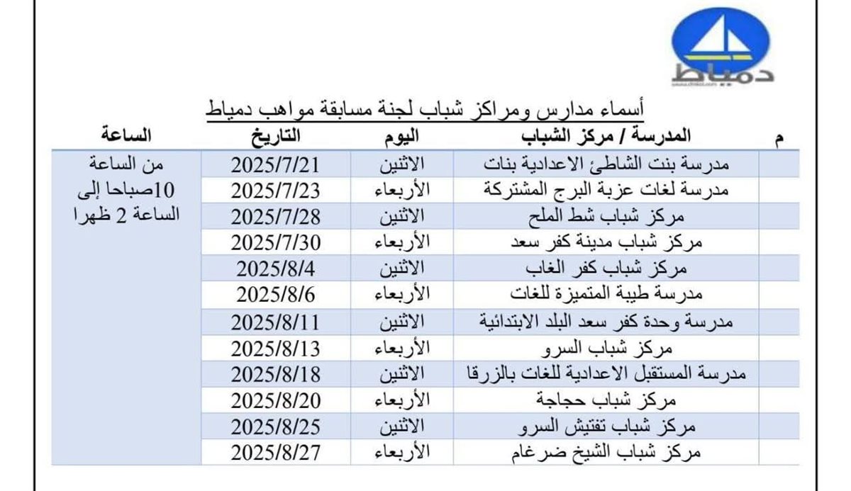 أعلنت محافظة دمياط عن انطلاق فعاليات مسابقة "مواهب دمياط - Damietta Talents" يوم الإثنين المقبل الموافق ٢١ يوليو الجاري، وذلك في إطار دعم الموهوبين وتنمية قدراتهم، تحت رعاية الأستاذ الدكتور أيمن الشهابي، محافظ دمياط، وإشراف المهندسة شيماء الصديق، نائب المحافظ، وذلك وفق جدول زمني محدد تم الإعلان عنه مسبقًا.