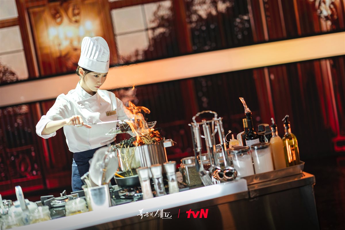 وتُظهر اللقطات الجديدة من مسلسل “Bon Appétit, Your Majesty” يون جي يونغ في عصرها الحالي كطاهية واثقة وموهوبة تدير مطبخ مطعم حاصل على ثلاث نجوم. تتسم يون جي يونغ بالشغف والفضول والفخر بكل ما يتعلق بفن الطهي، وتُبدع في كل جانب من جوانب أطباقها. لا تقتصر مهاراتها على المذاق الرائع فحسب، بل تمتد لتشمل العروض التقديمية الفنية المذهلة التي تُبهر الحضور.