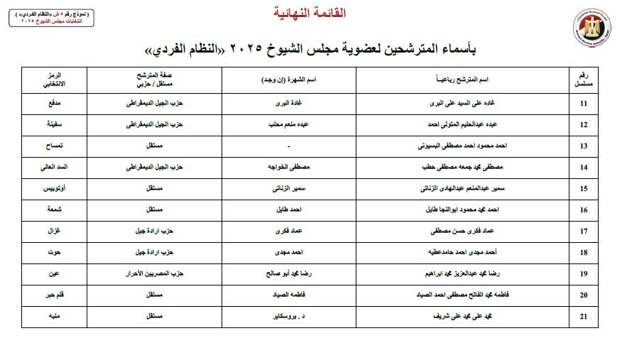 أعلنت الهيئة الوطنية للانتخابات عن القائمة النهائية لأسماء المرشحين لانتخابات مجلس الشيوخ ۲۰۲۵ بمحافظتي الدقهلية والقليوبية.