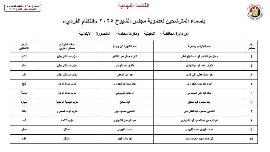 أسماء المرشحين في انتخابات الشيوخ بمحافظتي الدقهلية والقليوبية
