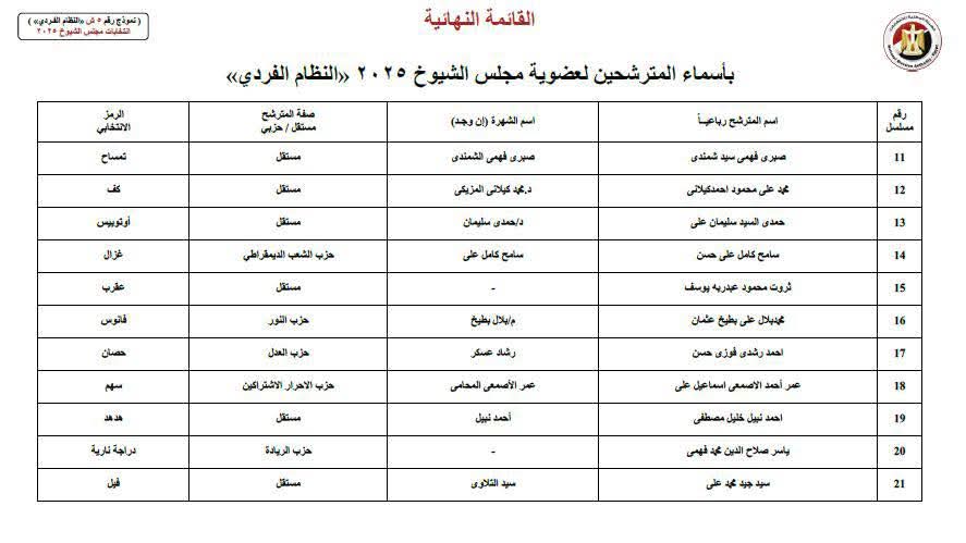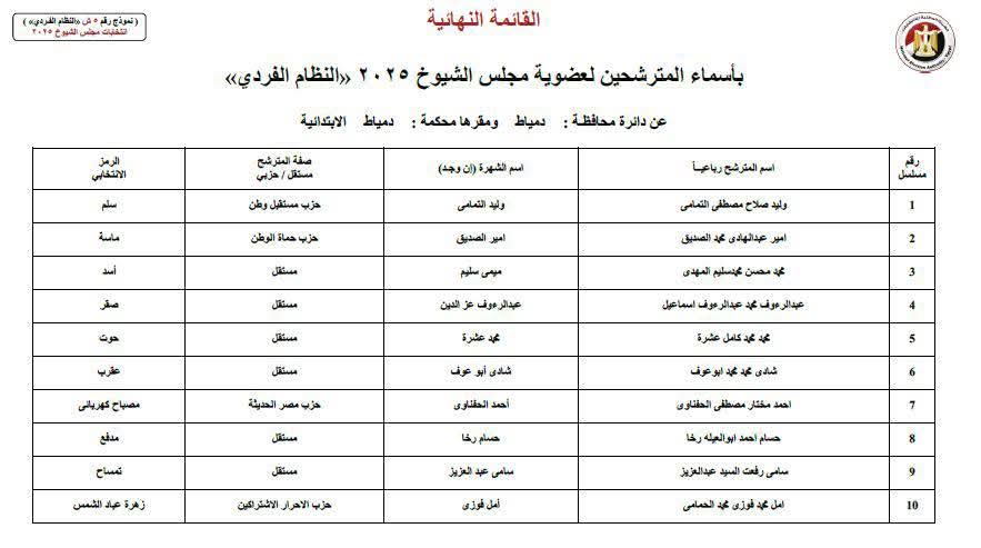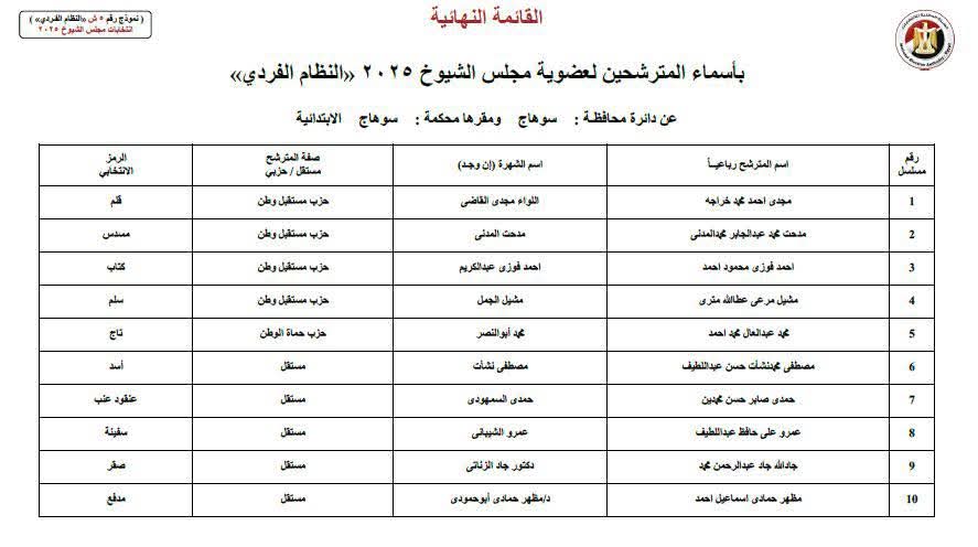 أعلنت الهيئة الوطنية للانتخابات القائمة النهائية للمرشحين في انتخابات مجلس الشيوخ 2025، لمحافظات سوهاج، ودمياط وجنوب سيناء.