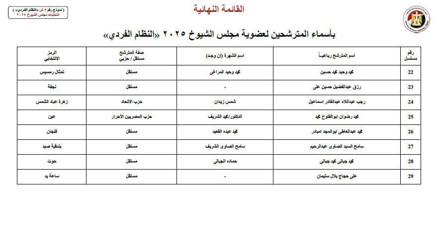 أسماء المرشحين بانتخابات الشيوخ في سوهاج ودمياط وجنوب سيناء