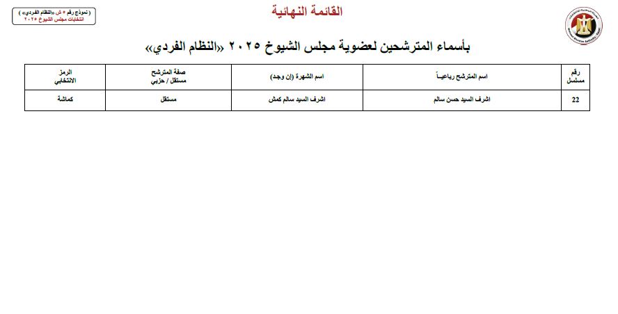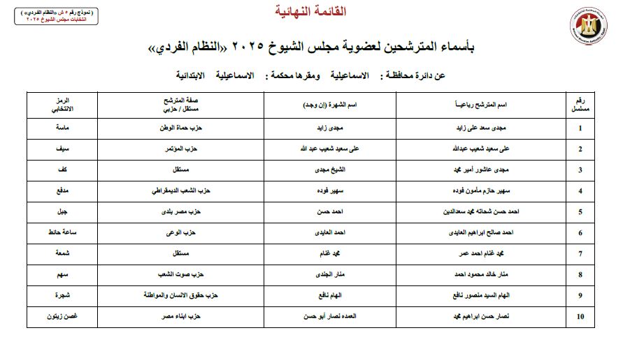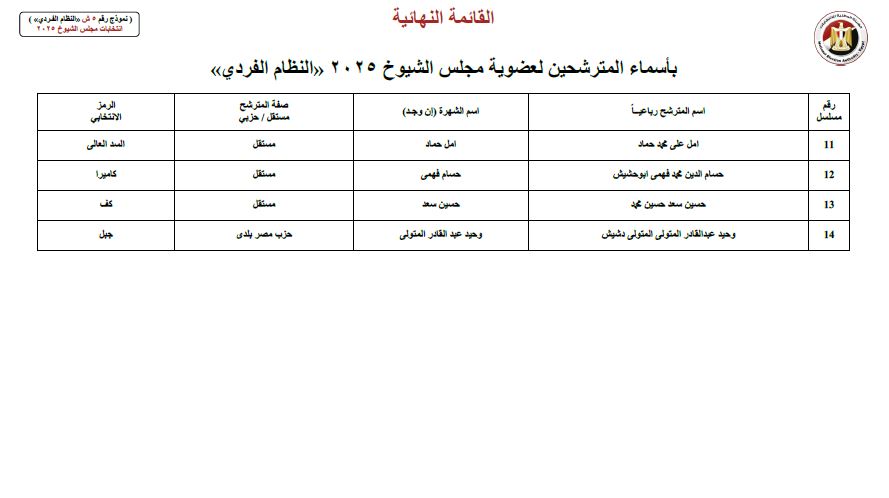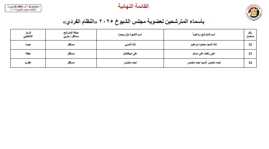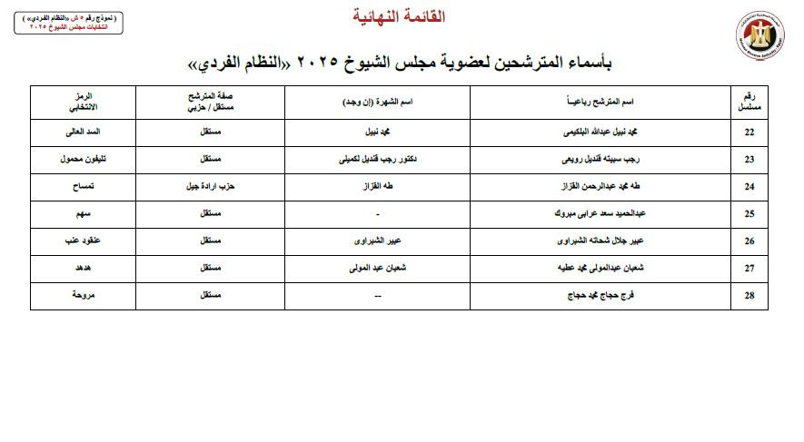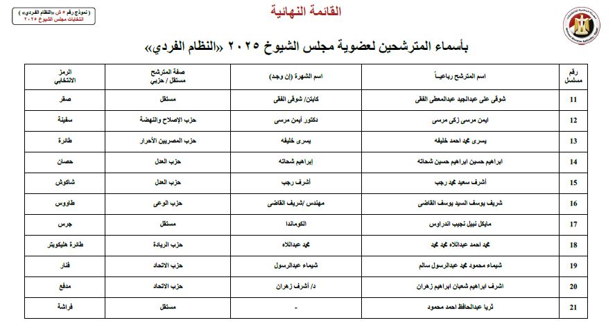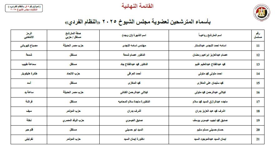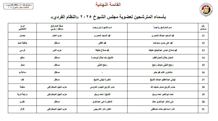 "الوطنية للانتخابات" تعلن أسماء المرشحين لـ مجلس الشيوخ في 9 محافظات