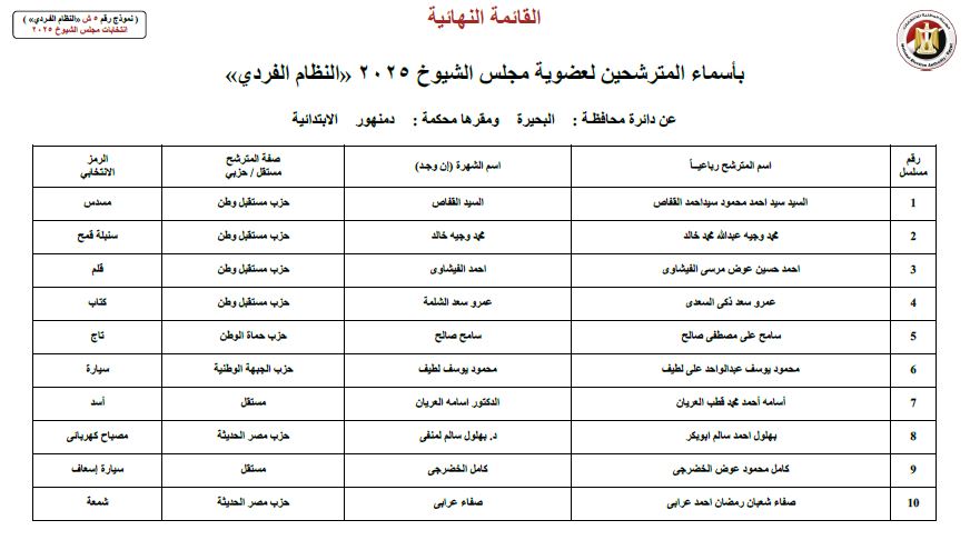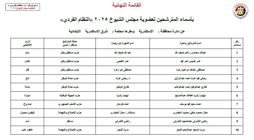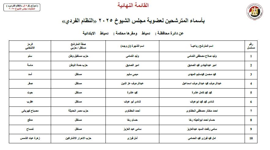 أعلنت الهيئة الوطنية للانتخابات برئاسة القاضي حازم بدوي عن أسماء المرشحين بمحافظات الشرقية، دمياط، الإسماعيلية، السويس، بورسعيد، جنوب سيناء، شمال سيناء، الإسكندرية، والبحيرة، ومطروح.