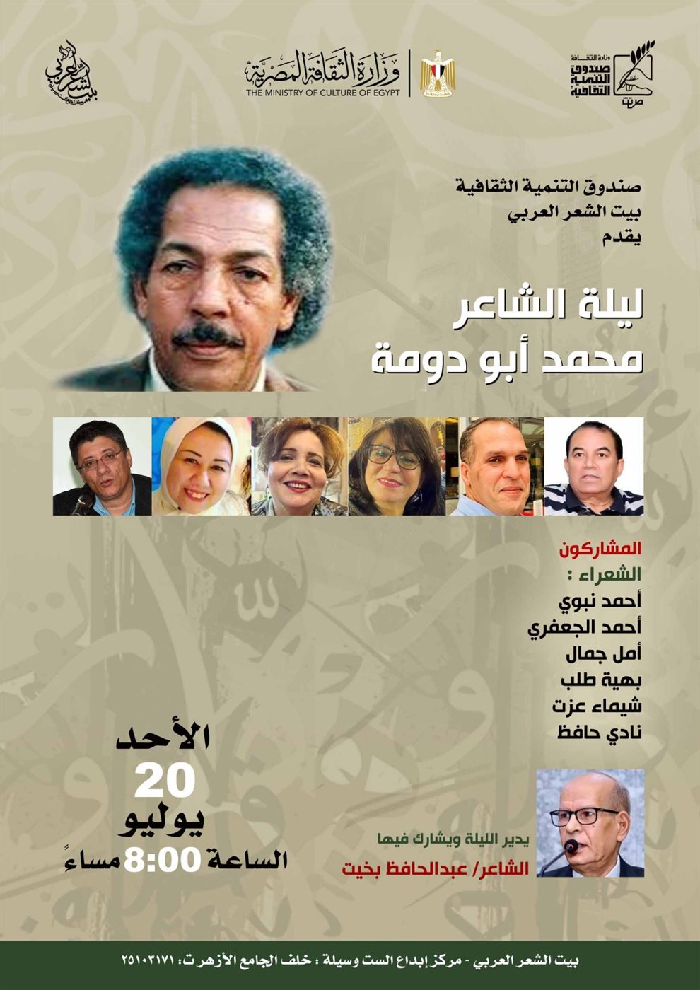 ينظم بيت الشعر العربي التابع لـ قطاع صندوق التنمية الثقافية برئاسة المعماري حمدي السطوحي، أمسيةً شعريةً في تمام الساعة الثامنة من مساء غد الأحد الموافق 20 يوليو، بمقر البيت في مركز إبداع الست وسيلة خلف الجامع الأزهر، وذلك ضمن برنامجه الثقافي لدعم الحركة الأدبية وتشجيع التواصل بين الأصوات الشعرية المعاصرة من مختلف المحافظات المصرية
