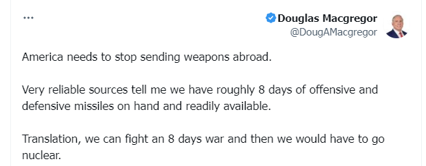 وقال الجنرال الأمريكي السابق دوجلاس ماكجريجور عن نفاد المخزون من الأسلحة الأمريكية: " يجب على أمريكا أن تتوقف عن إرسال الأسلحة إلى الخارج. وتقول مصادر موثوقة للغاية إن لدينا ما يكفي من الصواريخ الهجومية والدفاعية لمدة ثمانية أيام تقريبا وهي جاهزة للاستخدام".