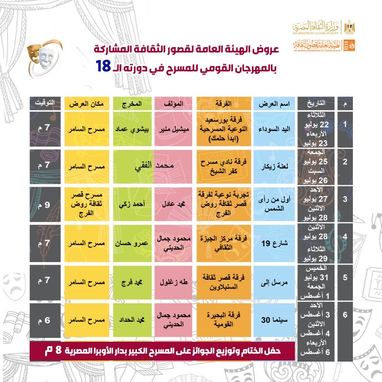 برنامج عروض قصور الثقافة في المهرجان القومي للمسرح في دورته الـ18