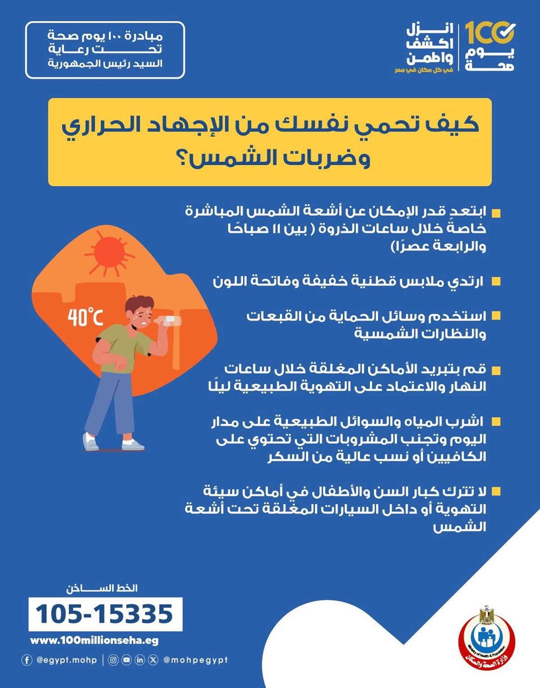 وأكدت وزارة الصحة والسكان، رفع درجة الاستعداد في جميع مستشفيات الجمهورية ووحدات الطوارئ، لضمان استقبال جميع الحالات الطارئة الناتجة عن التعرض للحرارة العالية، وتقديم الرعاية الطبية الفورية اللازمة، داعية المواطنين إلى متابعة النشرات الجوية بشكل مستمر، والالتزام الكامل بالإرشادات الوقائية، والتوجه فورًا إلى أقرب منشأة طبية حال ظهور أي أعراض تدل على الإصابة بالإجهاد الحراري أو ضربة الشمس، وذلك حفاظًا على سلامتهم وصحتهم العامة.